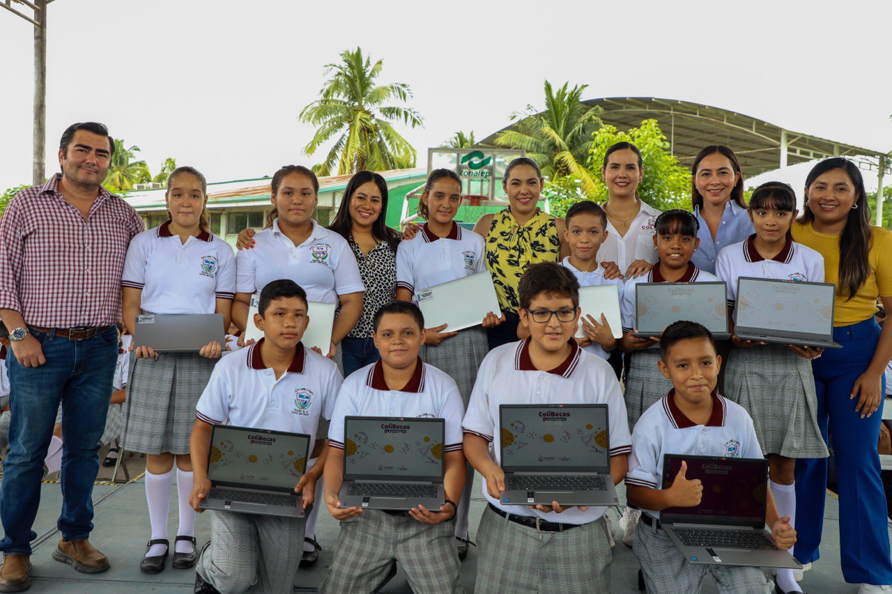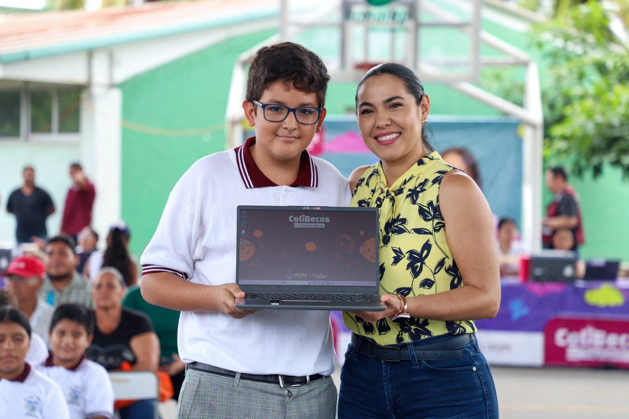 La gobernadora Indira Vizcaíno Silva sigue recorriendo los diez municipios para entregar a estudiantes de primer grado de secundaria, así como de licenciaturas e ingenierías de escuelas públicas, el programa ColiBecas Computadoras; este miércoles asistió a Manzanillo, donde 1,705 alumnas y alumnos de cuatro secundarias y diez carreras profesionales de la Universidad de Colima recibieron sus equipos gratuitos.