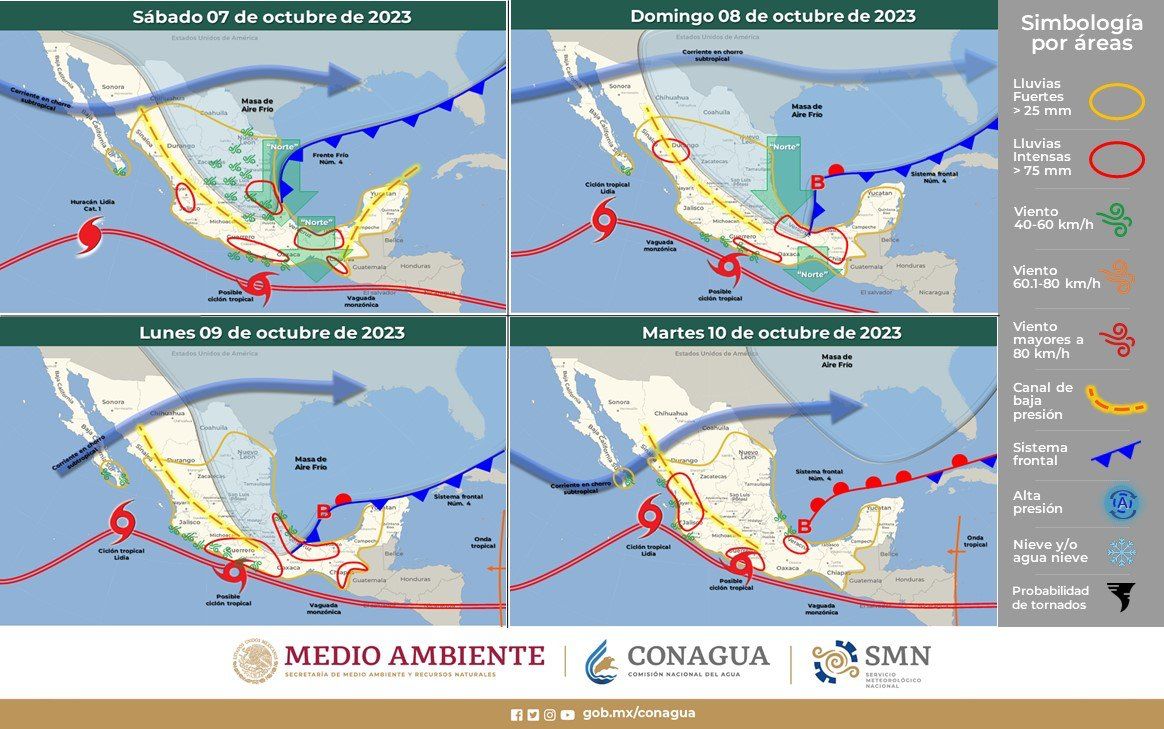 Esta noche y madrugada del 7 octubre, canales de baja presión extendidos sobre el occidente y centro del país, en interacción con el ingreso de humedad de ambos océanos, originarán lluvias muy fuertes en Sinaloa y Nayarit, así como fuertes en Colima, Aguascalientes, Jalisco, Michoacán, Estado de México, Tlaxcala, Morelos y Campeche.