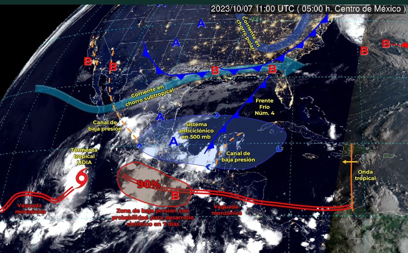 Hoy sábado 7 de octubre, el frente frío número 4 se desplazará gradualmente sobre el Golfo de México y en interacción con un centro de baja presión, mantienen muchas probabilidades de desarrollo ciclónico, originando lluvias puntuales muy fuertes en Colima, Michoacán y Tamaulipas, según el reporte oficial emitido esta mañana por el Servicio Meteorológico Nacional (SMN).