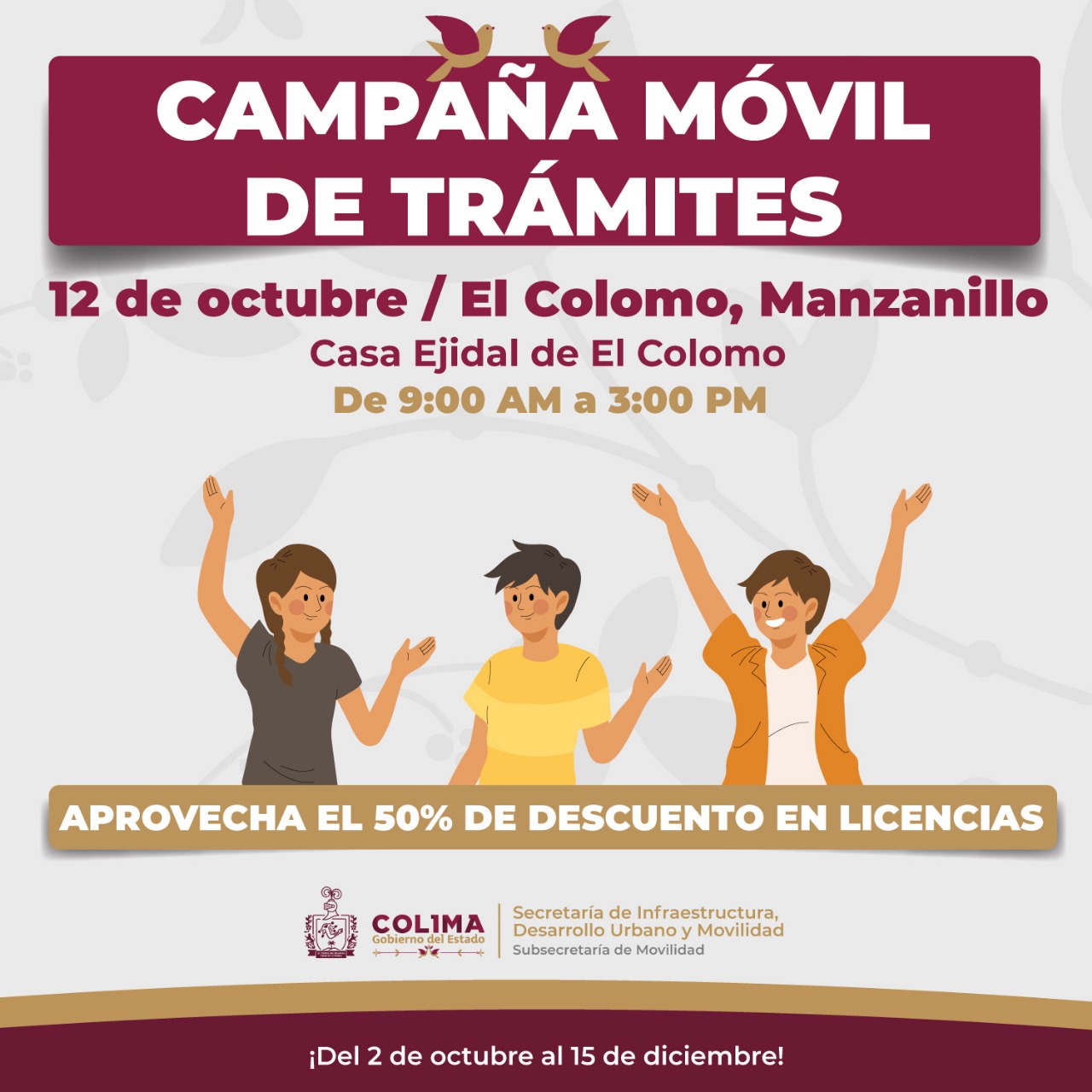 El Gobierno del Estado de Colima, a través de la Subsecretaría de Movilidad (Subsemov), informa que, como parte del periodo de descuentos en licencias, acercarán este trámite a las comunidades rurales de Manzanillo. La campaña móvil de descuentos en licencias de conducir es un esfuerzo para facilitar el acceso a este documento esencial para todas y todos los colimenses, en cualquier lugar.