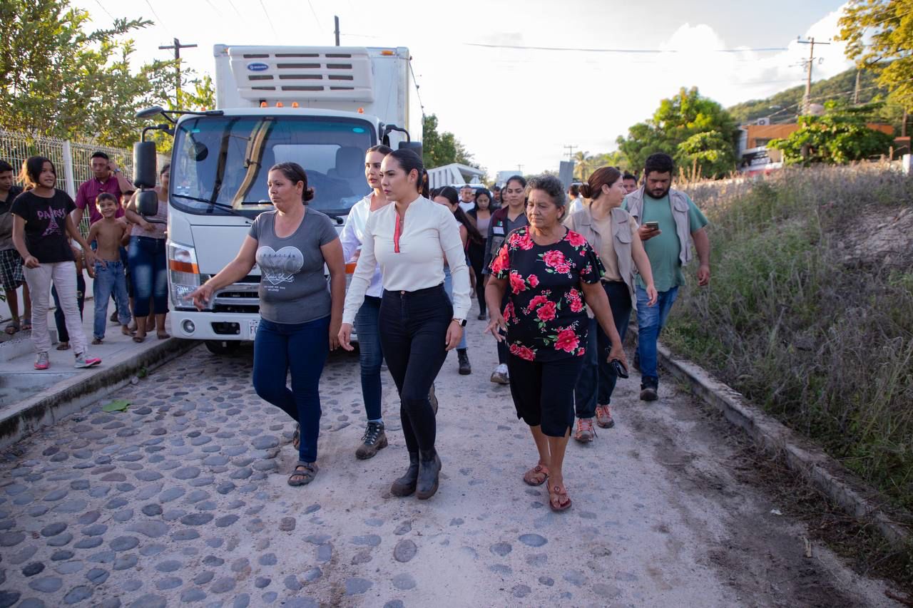 Posteriormente, Indira Vizcaíno y Rosi Bayardo se trasladaron a la comunidad rural de El Chavarín, donde visitaron a varias familias cuyos hogares resultaron inundados por el desbordamiento del río Marabasco, a quienes les llevaron despensas, cobertores y una brigada de limpieza.
