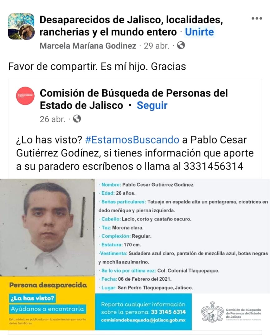 De acuerdo con la Unidad de Atención a Víctimas del Juzgado Cívico Municipal, se localizó una ficha de búsqueda a nombre de Pablo Cesar Gutiérrez Godínez, publicada en la red social de Facebook, el 26 de abril de 2023 por la Comisión de Búsqueda del Estado de Jalisco, quien reportaba su desaparición el 08 de febrero de 2021.