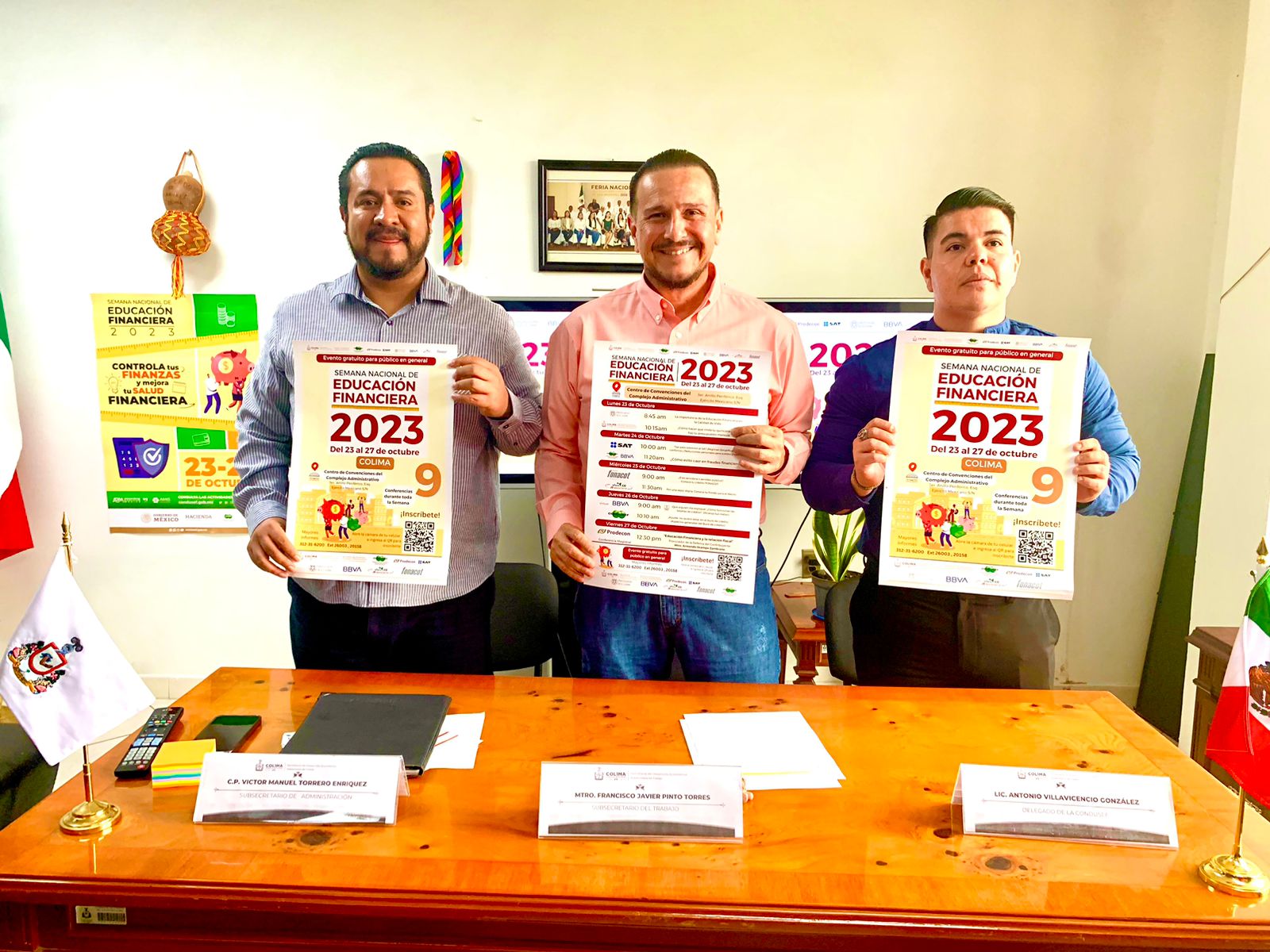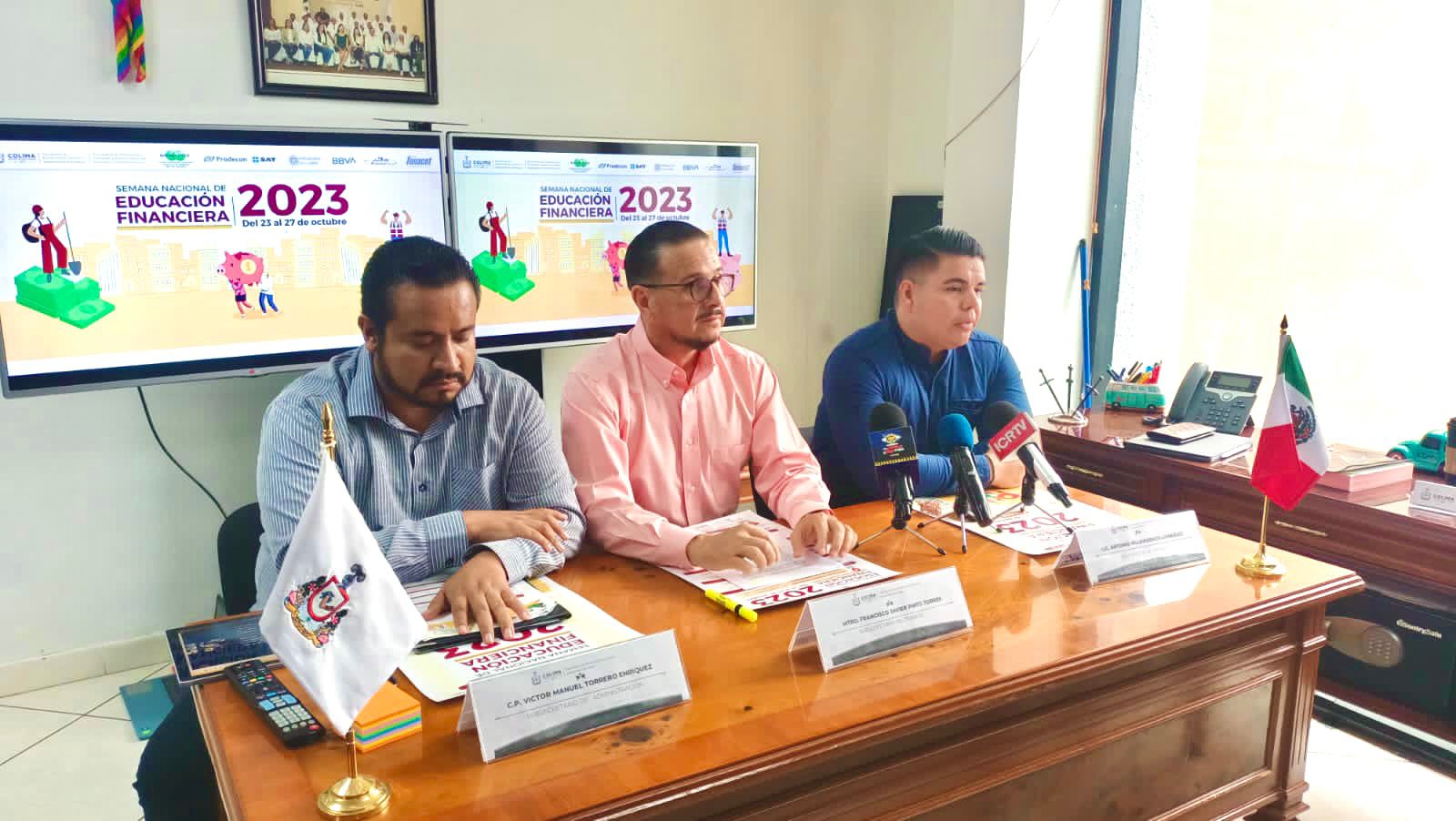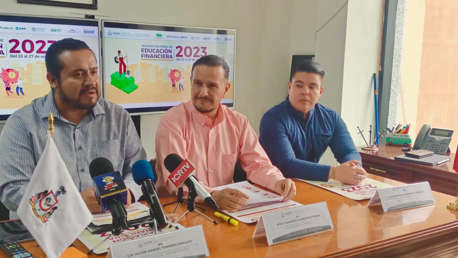 En rueda de prensa encabezada por el subsecretario del Trabajo del Gobierno del Estado de Colima, Francisco Javier Pinto Torres; el subsecretario de Administración, Víctor Manuel Torrero Enríquez y Antonio Villavicencio González, representante de la Comisión Nacional para la Protección y Defensa de los Usuarios de Servicios Financieros (Condusef) en Colima, presentaron el programa de los eventos que se desarrollarán a lo largo de dicha semana.