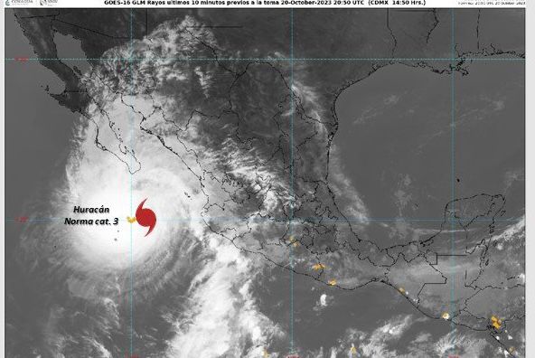 Esta noche y la madrugada del sábado, el huracán ‘Norma’ categoría 3 continuará dirigiéndose hacia el estado de Baja California Sur, sus extensas bandas nubosas mantendrán condiciones para lluvias puntuales torrenciales en esa entidad, lluvias puntuales intensas en Sinaloa y Nayarit, así como lluvias muy fuertes en Jalisco, Colima y Michoacán, las cuales podrían incrementar los niveles de ríos y arroyos, y generar deslaves e inundaciones.