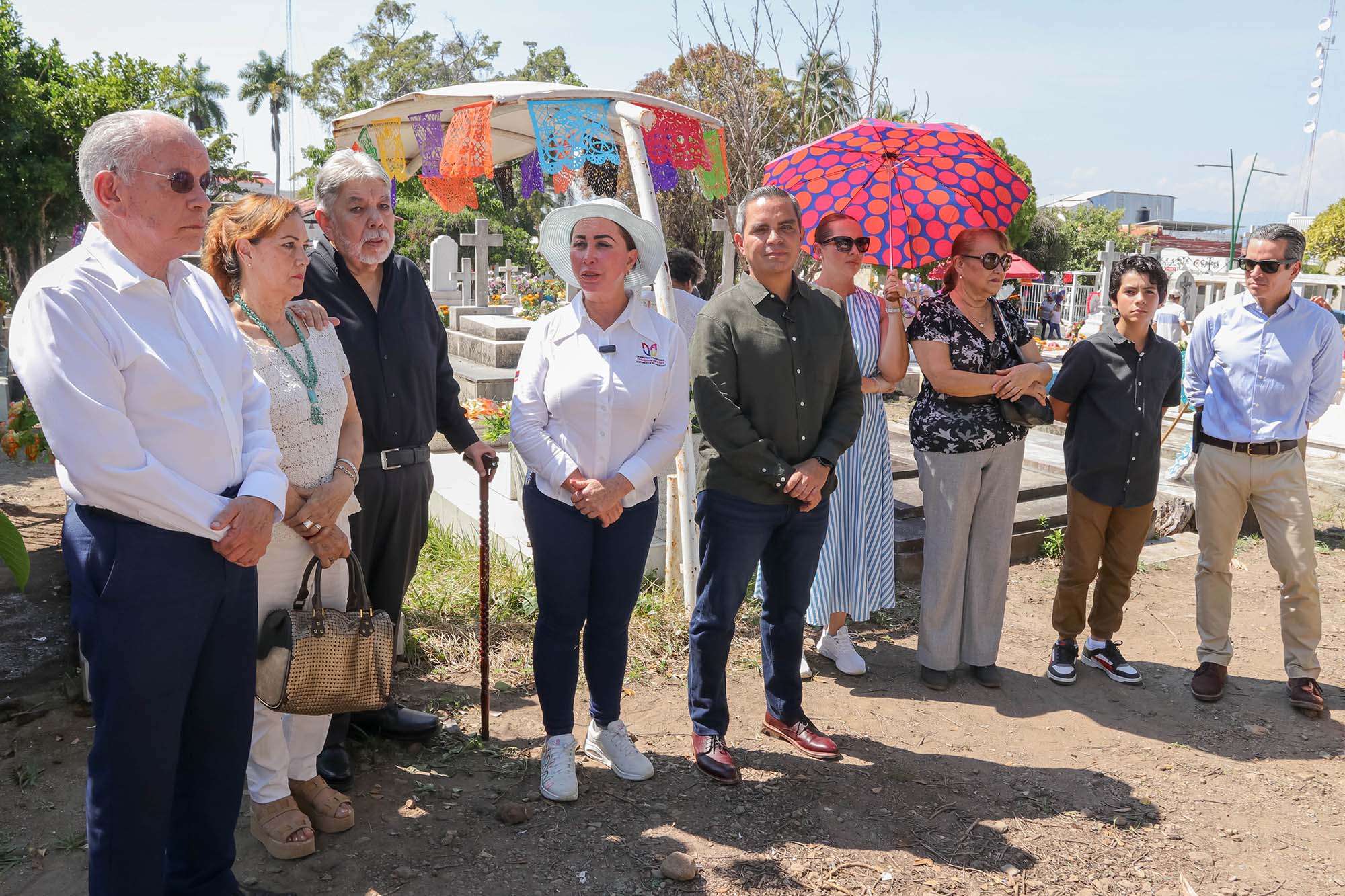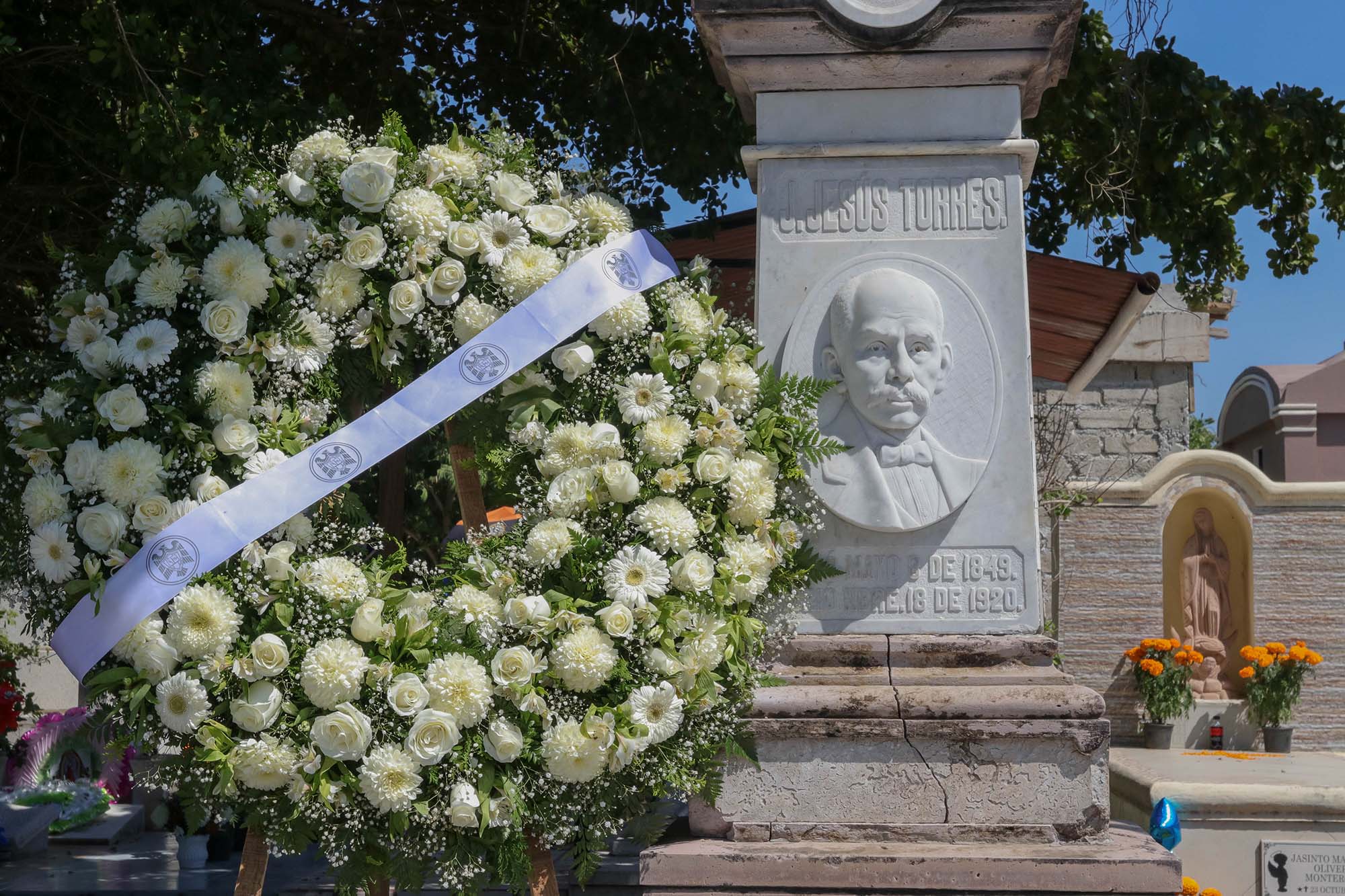 Este Día de los Fieles Difuntos, el Ayuntamiento de Villa de Álvarez, a través de su presidenta Esther Gutiérrez Andrade, rindió un homenaje y colocó una ofrenda floral en la tumba del general Pedro Torres Ortiz, ubicada en el panteón municipal de Colima.
