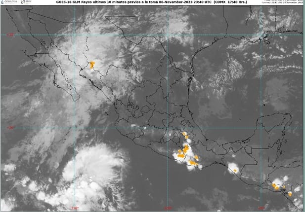 Durante las próximas horas, el frente frío número 9 sobre la República Mexicana y una línea seca, ocasionarán lluvias puntuales fuertes acompañadas de descargas eléctricas y posible caída de granizo en *Colima*, Jalisco, Michoacán, Baja California Sur, Chihuahua, Durango, Sinaloa, Nayarit y Morelos.