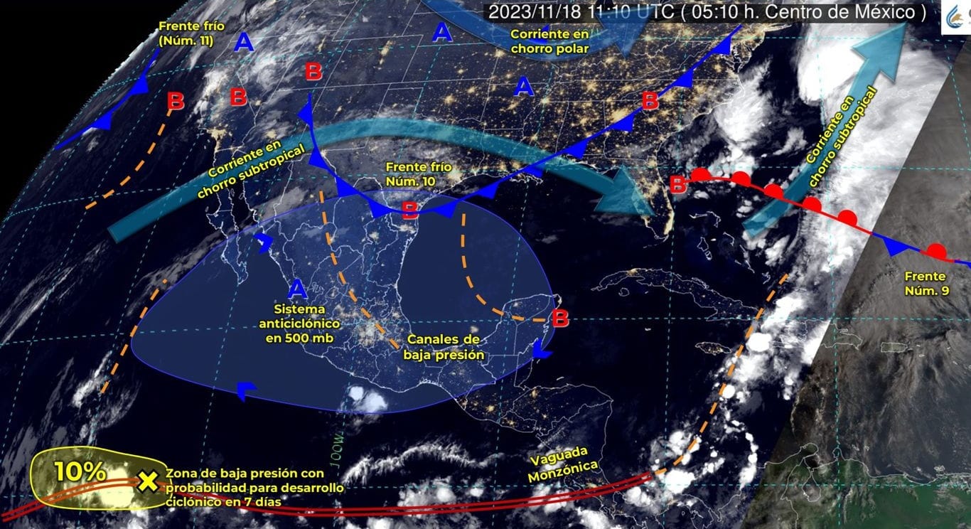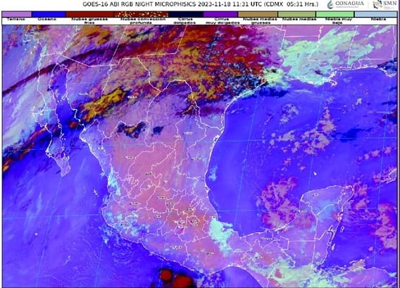 Hoy sábado 18 de noviembre, el sistema anticiclónico en niveles medios y altos de la atmósfera mantendrá el cielo despejado con baja probabilidad de lluvia y ambiente cálido a caluroso en la mayor parte del país, con temperaturas máximas de 35 a 40 grados Celsius en Colima, Jalisco, Michoacán, Guerrero, Sonora, Sinaloa, Nayarit, Oaxaca y Chiapas, informa el Servicio Meteorológico Nacional (SMN).