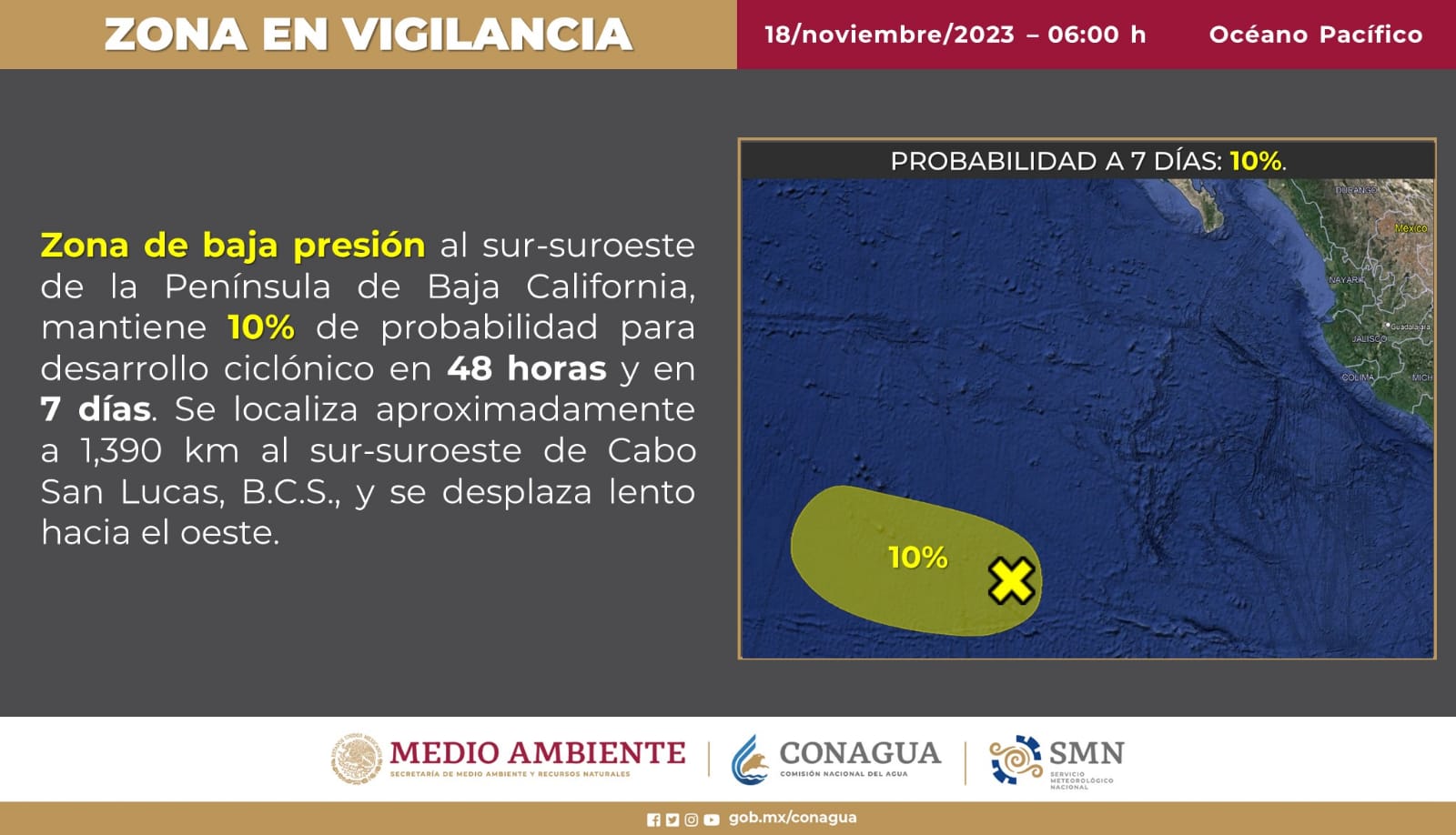 El organismo de la Comisión Nacional del Agua (Conagua) indica que en algunas zonas del estado de Colima podrían registrarse lluvias aisladas de hasta 5 milímetros, al igual que en Baja California Sur, Chihuahua, Michoacán y Veracruz.