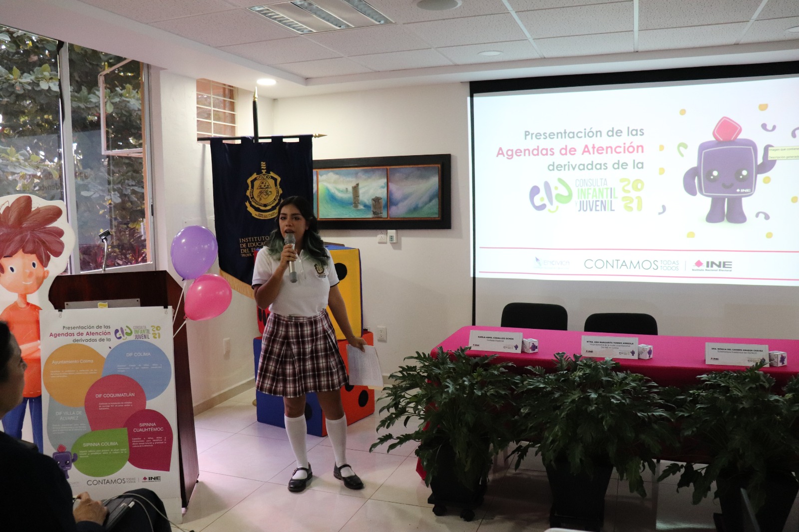 En el evento, la y el adolescente Karla Abril Ceballos Ochoa al hacer uso de la voz, consideró que las consultas infantiles son una herramienta muy importante, que ayuda al INE a recopilar una estadística importante de los retos y dificultades de tipo social, psicológica, familiar, educativa, de riesgos, entre otros tantos aspectos en que vive la niñez y la juventud de cada uno de los municipios de Colima.