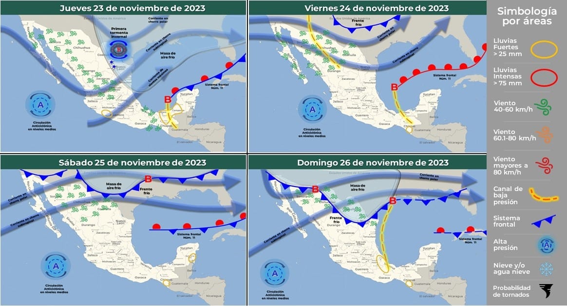 Respecto a las temperaturas, el SMN estima que, para este jueves 23 de noviembre, el estado de Colima alcanzará registros máximos de entre 30 y 35 grados Celsius, al igual que en Jalisco, Michoacán, Guerrero, Oaxaca (costa), Chiapas (costa), Campeche, Yucatán y Quintana Roo.
