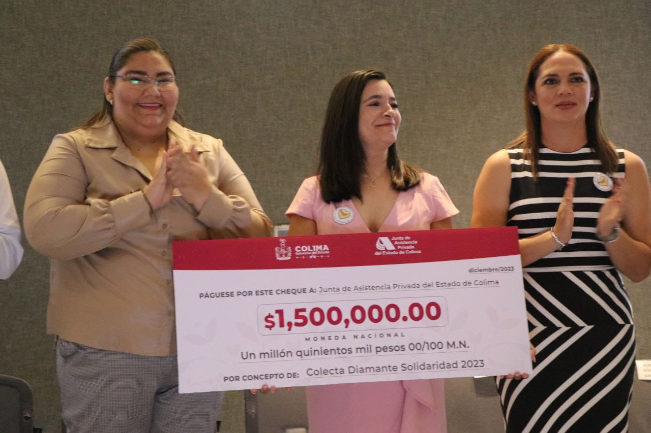 La encargada de despacho de la Sebiinsom, en representación de la gobernadora Indira Vizcaíno entregó simbólicamente el cheque por el donativo de millón y medio de pesos que hizo Gobierno del Estado de Colima y que ya fue depositado. Se informó que se recaudaron 2 millones 523 mil 715 pesos en esta Colecta ‘Diamante de la Solidaridad’ 2023.