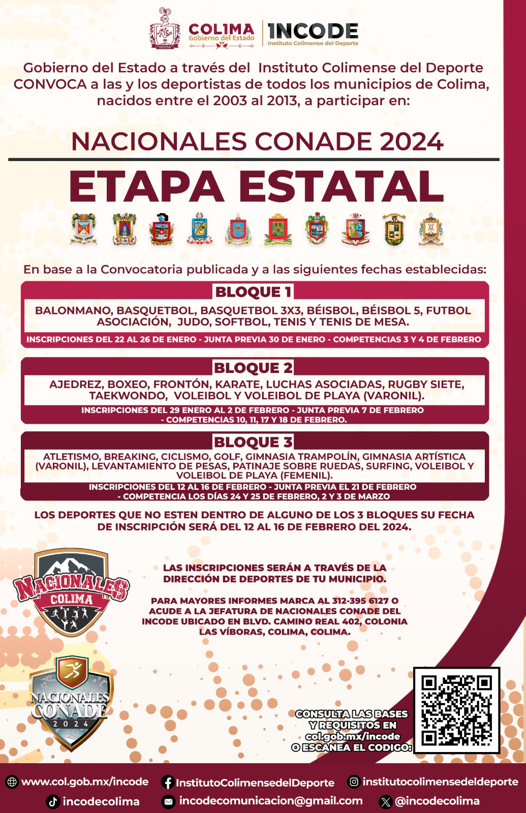 El Gobierno del Estado de Colima, a través del Instituto Colimense del Deporte (Incode), publica la convocatoria para la etapa estatal de los Nacionales Conade 2024, donde se invita a atletas de toda la entidad, nacidos de 2003 al 2013, a participar en este evento multideportivo convocado por la Comisión Nacional de Cultura Física y Deporte (Conade), con fundamento en la Ley de Cultura Física y Deporte.