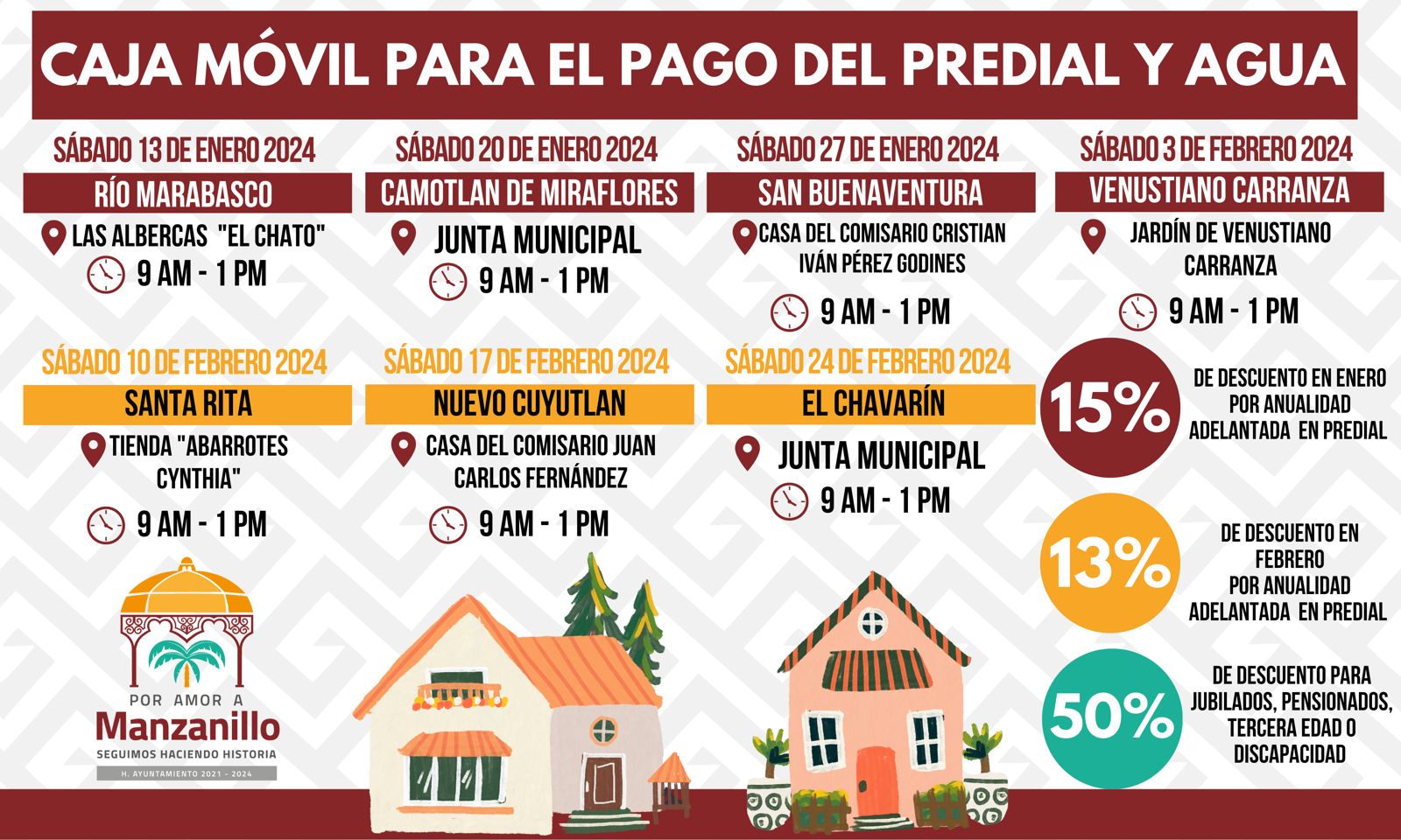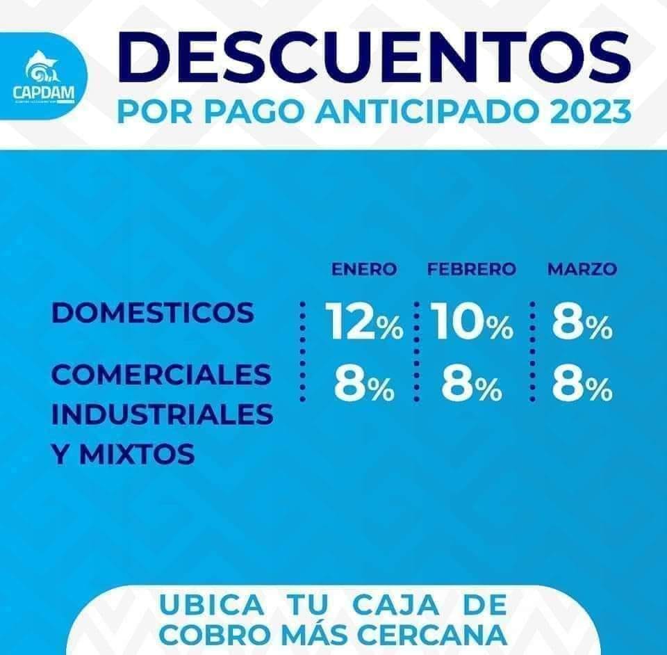 Recordamos que durante el mes de enero se ofrece a la población un descuento de 15% sobre la anualidad del predial y 12% en el pago de la anualidad de los servicios de agua potable, drenaje y alcantarillado. También las personas que así lo prefieran pueden realizar sus pagos en línea en www.manzanillo.gob.mx