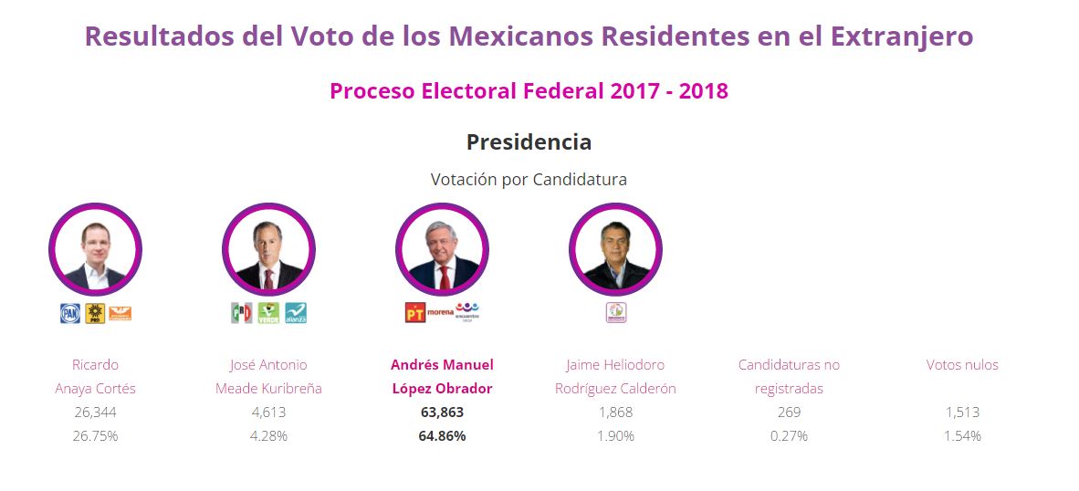 El INE a través de la página Voto Extranjero muestra los resultados del voto por mexicanos residentes en el extranjero durante las elecciones federales 2017-2018; donde los números fueron favorable para Andrés Manuel López Obrador con un 64.86%, 63 mil 863 votos, en aquel entonces, el actual presidente de la República representaba la coalición entre MORENA-PT-Encuentro Social.