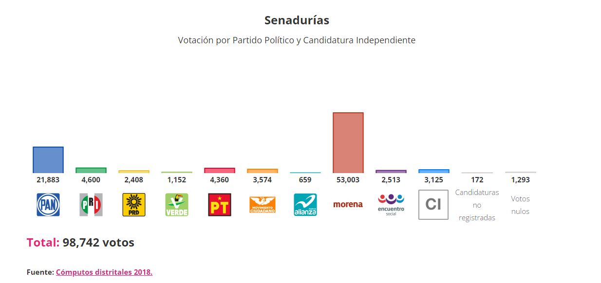 En cuanto a la votación por partido político, MORENA obtuvo 55 mil 344, PT 5 mil 411 y Encuentro Social 3 mil 108, refiriéndonos a los representados por AMLO.