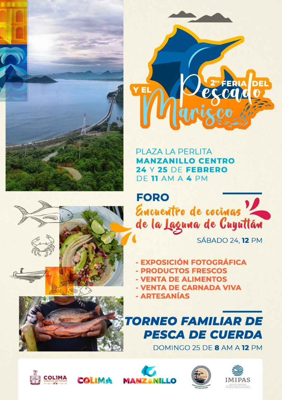 El Gobierno del Estado de Colima, a través de las subsecretarías de Turismo y Desarrollo Rural, el Instituto Mexicano de Investigación en Pesca y Acuacultura Sustentables (IMIPAS) y la Administración del Sistema Portuario Nacional (Asipona) invitan a la ‘Segunda Feria del Pescado y el Marisco’, a efectuarse en la plaza La Perlita de Manzanillo, el sábado 24 y domingo 25 de febrero, de las 11 de la mañana a las 4 de la tarde.