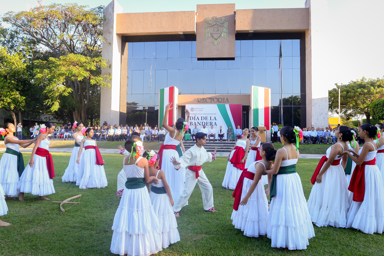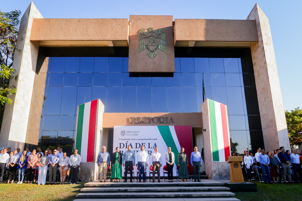 En el marco del Día de la Bandera, el rector de la Universidad de Colima, Christian Jorge Torres Ortiz Zermeño, encabezó una ceremonia cívica en la explanada de rectoría, donde resaltó la importancia de este símbolo patrio para la formación ciudadana de los y las estudiantes.