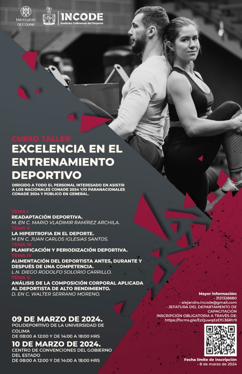 El Instituto Colimense del Deporte (Incode), en coordinación con la Universidad de Colima, realizará el 9 y 10 de marzo próximo el curso-taller ‘Excelencia en el Entrenamiento Deportivo’ con la finalidad de preparar y actualizar al personal interesado en asistir a los Nacionales y/o los Paranacionales Conade 2024, informó el director general de esta dependencia, Alejandro Rodríguez Alvarado.