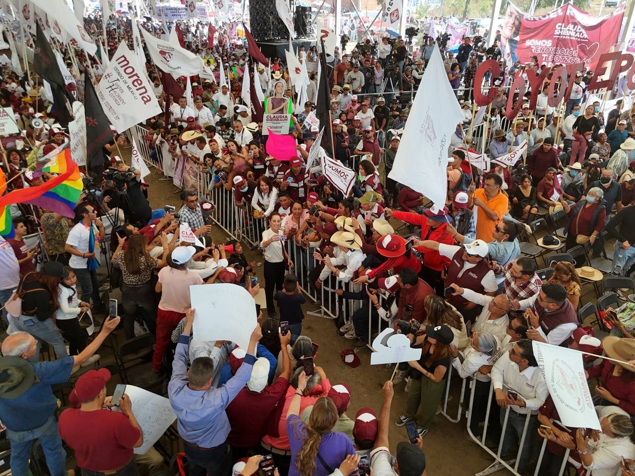 Ante las y los mexiquenses, Claudia Sheinbaum aseveró que, además de garantizar darle continuidad a las obras y acciones impulsadas por la Cuarta Transformación, —como el Tren Maya, la pensión para adultos mayores, garantizar el aumento del salario mínimo, entre otros—, también puntualizó que su gobierno seguirá velando por el bienestar de todos y todas los mexicanos a través de la creación de becas para todos los niños y niñas que estudian preescolar, primaria y secundaria en escuelas públicas; brindar apoyo a los jóvenes con más preparatorias y universidades; asegurar la distribución de medicamentos gratuitos; la construcción de más vivienda, pero en especial brindar más apoyo a las mujeres.
