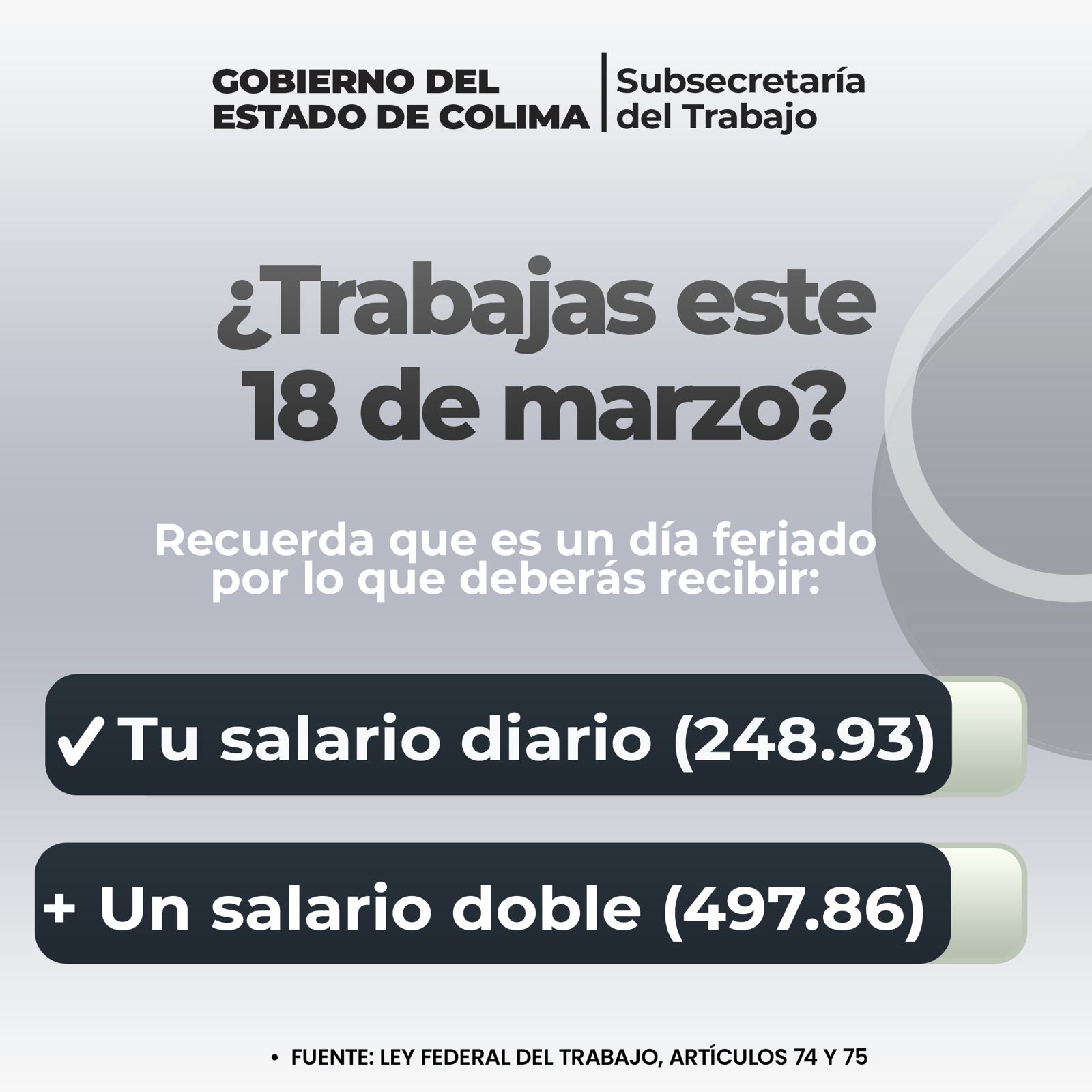 El próximo lunes 18 de marzo es considerado día de descanso obligatorio, al conmemorarse el natalicio de don Benito Juárez, que, si bien se celebra el 21 de marzo, la Ley Federal del Trabajo (LFT) en su Artículo 74, designa el tercer lunes de marzo como descanso obligatorio, por lo que quienes laboren en esta fecha, deberán recibir el doble de su salario.
