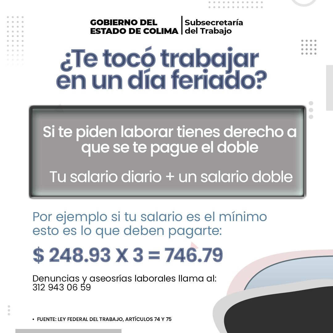 Por ejemplo, si una persona trabajadora recibe un salario mínimo por día (es decir 248.93 pesos), tiene derecho al pago de su salario más el doble del mismo que sería 497.86, lo que resulta como total 746.79 pesos por esa jornada laboral en día de descanso obligatorio, derecho que no puede negarse.