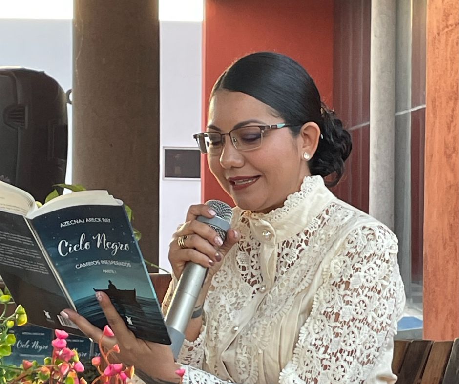 En esta ocasión, estuvo como invitada la escritora, conocida por su seudónimo, Azecnaj Areck Ray, quien presentó su libro “Cielo Negro, cambios inesperados, Parte I”, en compañía de las maestras María Monserrat Corona Rangel y Nohemí Zúñiga Preciado, promotoras de la lectura en este municipio.