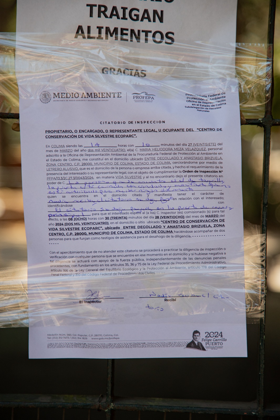 El personal de la dependencia federal buscaba entregar también un citatorio a las personas encargadas del parque, para dar seguimiento a las denuncias de la ciudadanía, sin embargo, ante la negativa de la persona que vigila la entrada al recinto, de recibir dicho documento, este fue colocado en la puerta del acceso principal.