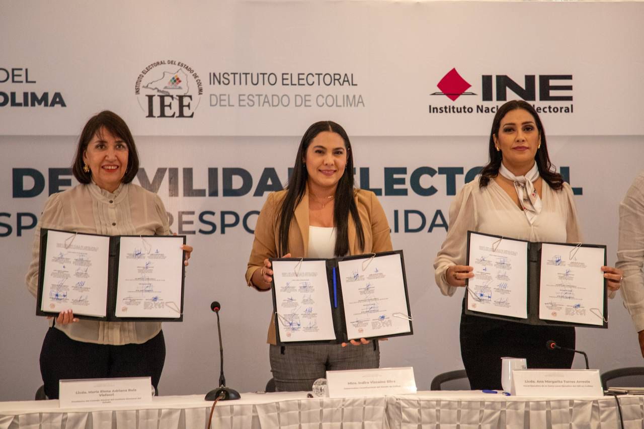 El documento fue signado por representantes de los partidos PAN, PRI, PRD, PT, PVEM, MC, Morena, Nueva Alianza, PES y Fuerza por México; María Elena Adriana Ruiz Visfocri, presidenta del Consejo General del Instituto Electoral del Estado (IEE); Ana Margarita Torres Arreola, vocal ejecutiva de la Junta Local Ejecutiva del INE en Colima, y como testigos de honor el diputado Alfredo Álvarez Ramírez, presidente de la Mesa Directiva del Congreso del Estado; y el magistrado Juan Carlos Montes y Montes, presidente del Supremo Tribunal de Justicia del Estado, además de la mandataria estatal.