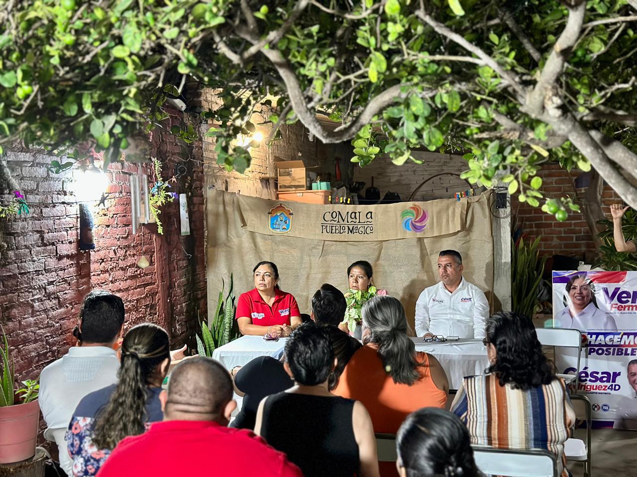 En un encuentro enriquecedor que fortalece el diálogo con la gente trabajadora y que da a conocer sus productos a todo el turismo que visita Comala, la candidata a la alcaldía del pueblo blanco por la Coalición Fuerza y Corazón por Colima Vero Fermín, llevó a cabo una reunión con los artesanos y productores que cada domingo participan en la plaza principal en el municipio, ahí en compañía de César Rodríguez candidato a diputado por el cuarto distrito electoral de la misma Coalición, escucharon detenidamente todas las necesidades e inconvenientes de los 29 participantes que semana tras semana se instalan en los portales del ayuntamiento.