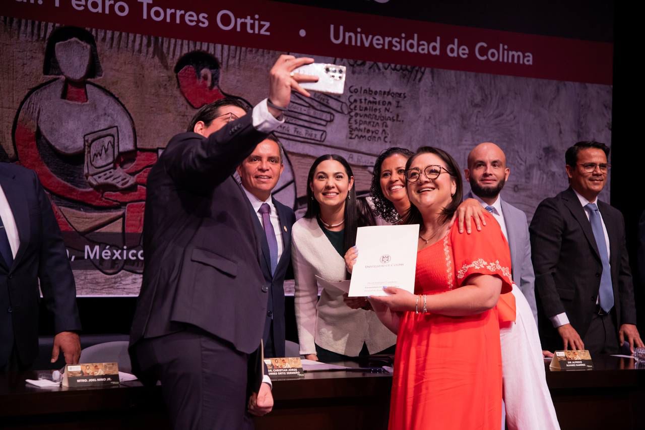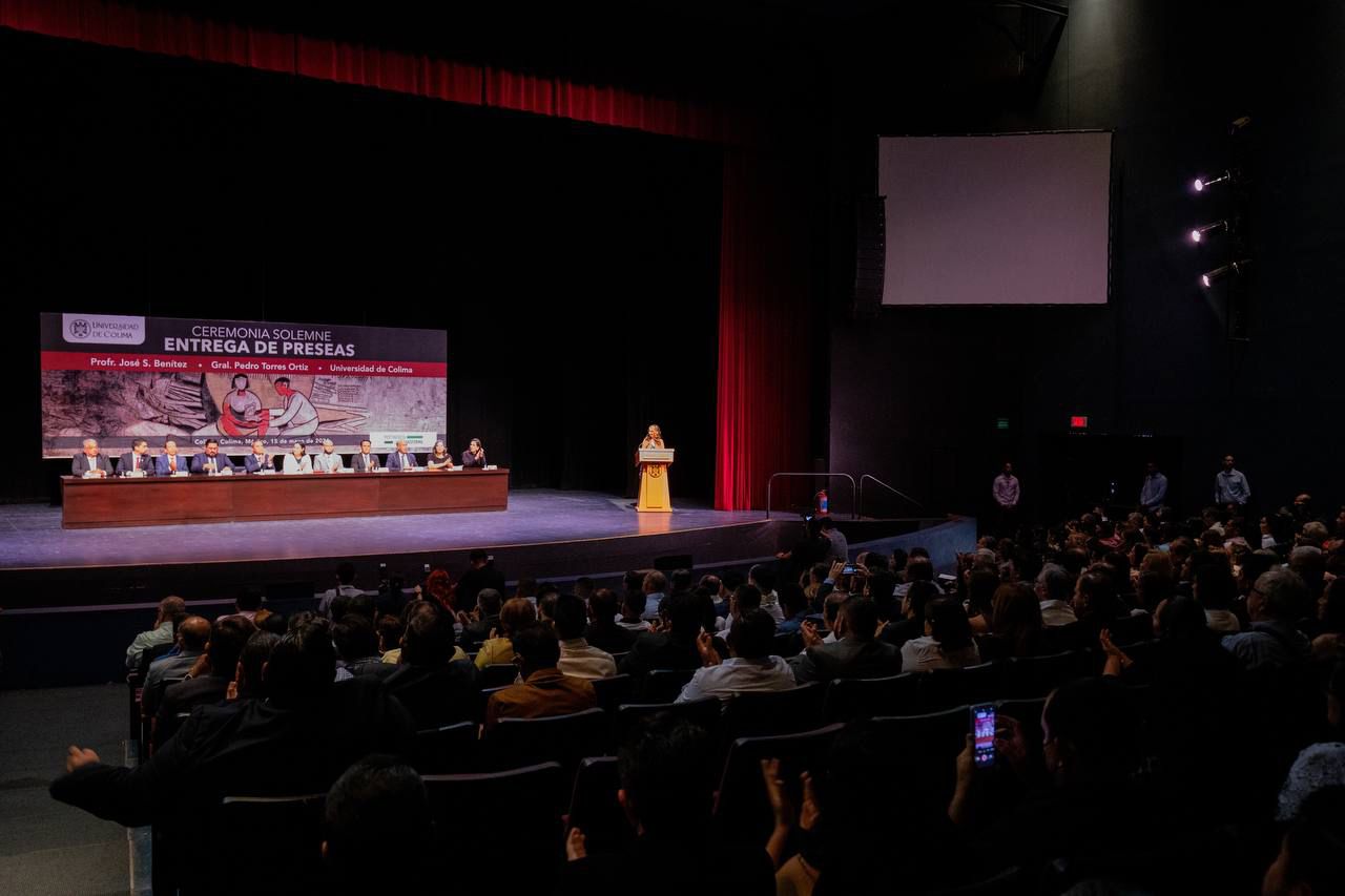 La gobernadora Indira Vizcaíno Silva atestiguó la entrega de preseas por quince, veinte y 25 años de servicio a la Universidad de Colima, así como reconocimientos a mejores docentes de esta casa de estudios, que encabezó el rector Christian Jorge Torres Ortiz Zermeño.