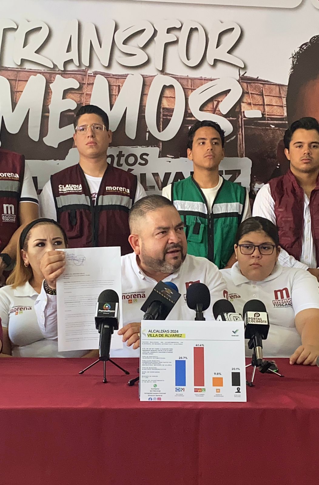 Esta mañana, en rueda de prensa, el candidato a la presidencia municipal de Villa de Álvarez por Morena-PT-Verde, Guillermo Toscano Reyes, acompañado de su familia e integrantes de su planilla, presentó una encuesta que le da más de 12 puntos de ventaja contra la candidata del PRI-PAN.
