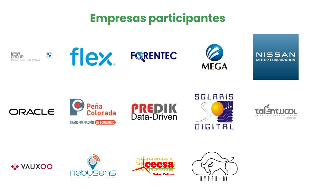 Participarán las siguientes empresas: BMW Group (Planta San Luis Potosí), ORACLE, Peña Colorada, Cecsa Solar Colima, Predik Data-Driven, Solaris Digital, Talent UCOL, Forentec (ciberseguridad), Nebusens (localización y sensorización), Megacable, Flex, Vauxoo, Hyper-Ox y NISSAN Motor Corporation.