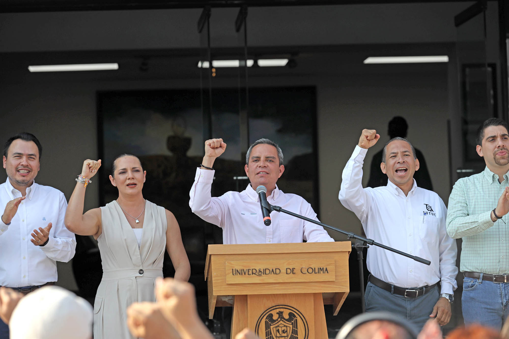 Acompañaron al rector Joel Nino, secretario general de la UdeC; Blanca Liliana Díaz, presidenta del Voluntariado; Camilo García, presidente de la FEC; Luis Enrique Zamorano, secretario general del SUTUC; Carolina Venegas, presidenta de la FEUC; Azucena Evangelista, presidenta de la ACU y Jesús Campos, presidente de la Asociación de Jubilados y Pensionados de la UdeC.