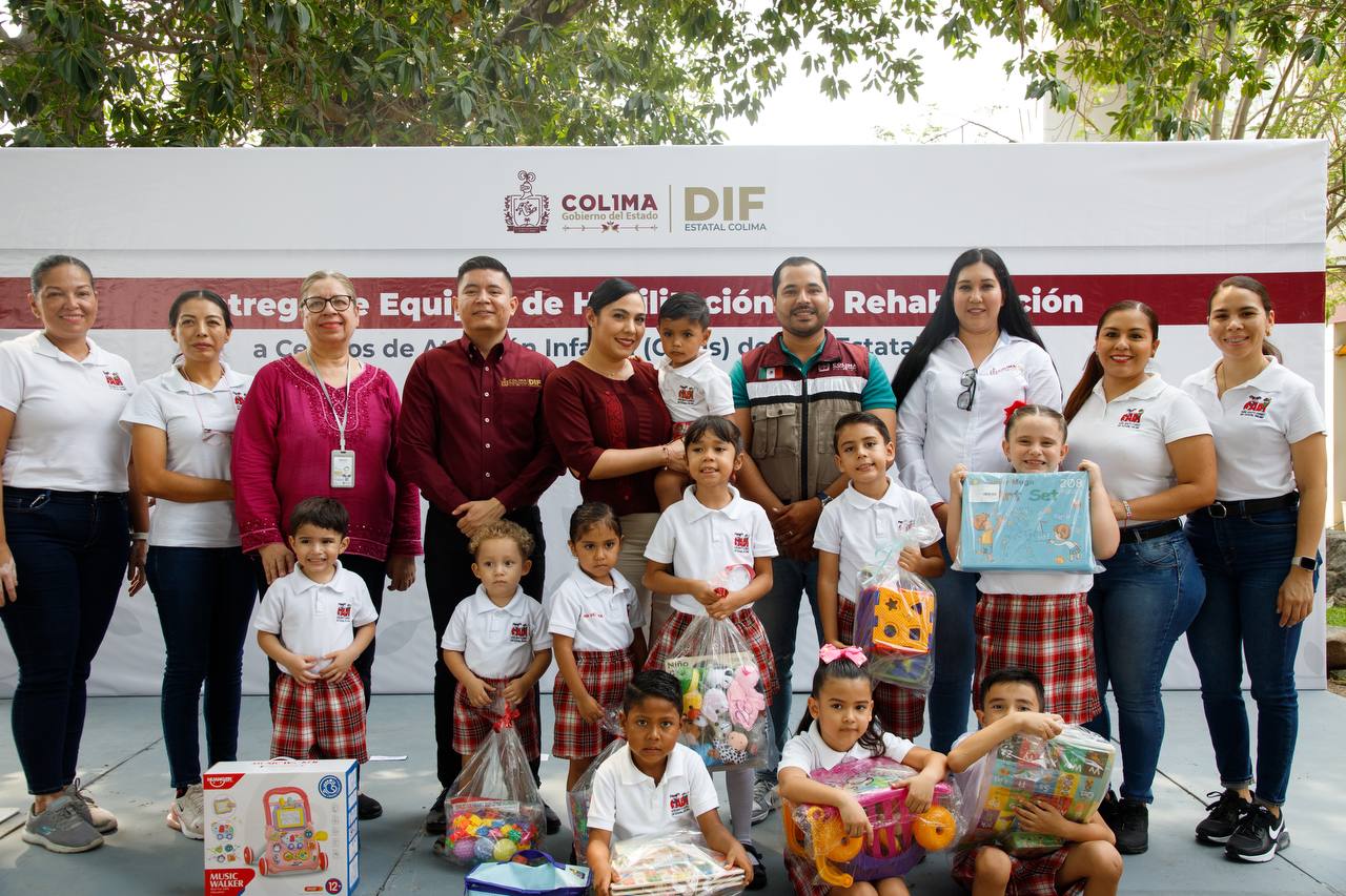 El Gobierno del Estado de Colima entregó este martes equipos de habilitación y rehabilitación, así como material didáctico y lúdico, que DIF Estatal gestionó ante el DIF Nacional para los Centros de Atención Infantil (Cadis) en la entidad; además, fue develado un mapa háptico en la planta baja del Complejo de Atención a Grupos Vulnerables, para que las personas ciegas y con debilidad visual se puedan guiar.