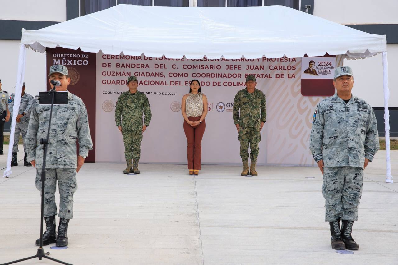 La tarde de este lunes se realizó la Ceremonia de Toma de Posesión del Cargo y Protesta de Bandera del comisario en jefe Juan Carlos Guzmán Giadans, como coordinador estatal de la Guardia Nacional (GN) en Colima, quien suple en este encargo a José Benito Romero Líbano.