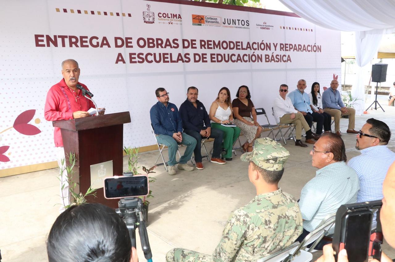 El secretario de Educación y Cultura del Gobierno del Estado de Colima, Adolfo Núñez González, encabezó la entrega de obras de remodelación y reparación en diez planteles escolares de Manzanillo, que fueron intervenidos con recursos por más de un millón 640 mil pesos, obtenidos en la ‘6ª Carrera con Causa Contecon’, que benefician a 3 mil 100 estudiantes manzanillenses.