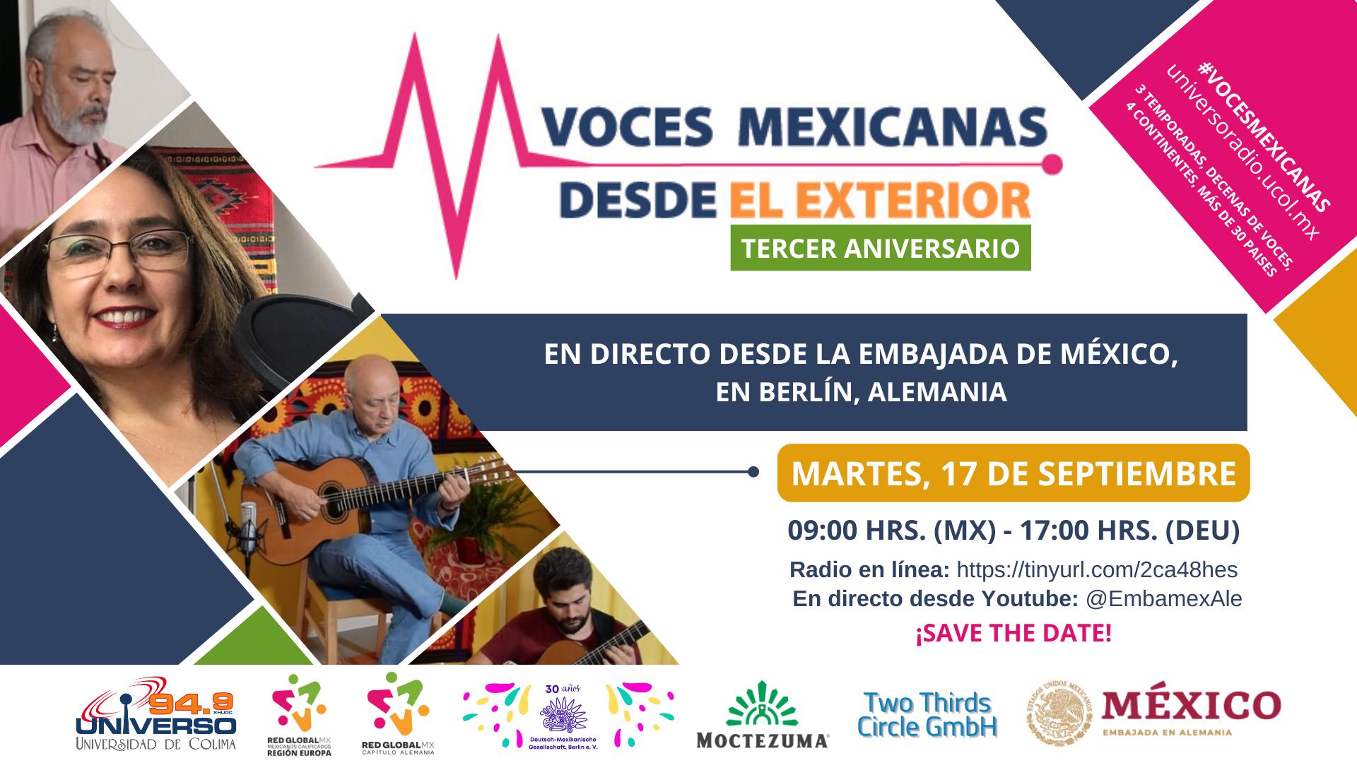 Para celebrar el tercer aniversario del programa de radio: “Voces Mexicanas desde el Exterior”, que produce la Mtra. Alejandra Balleza Casillas como parte de la Red Global MX, este martes 17 se realizará una transmisión especial a través de Universo 94.9 de un evento especial desde las instalaciones de la Embajada de México en Alemania.