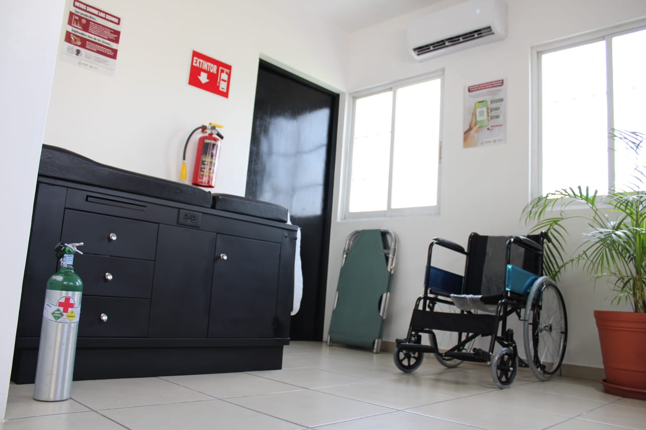 El nuevo módulo está equipado con una cama de exploración, camilla de transporte, silla de ruedas, tanque de oxígeno portátil y un botiquín, además, los tres desfibriladores externos automáticos (DEA) distribuidos en los edificios del complejo, que lo convierte en un área cardioprotegida.