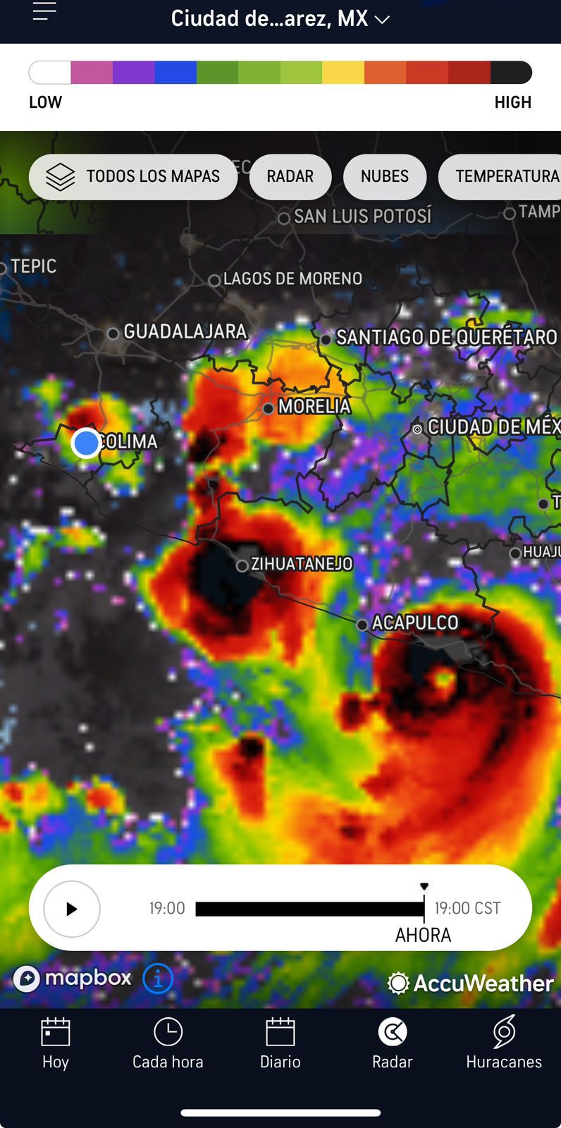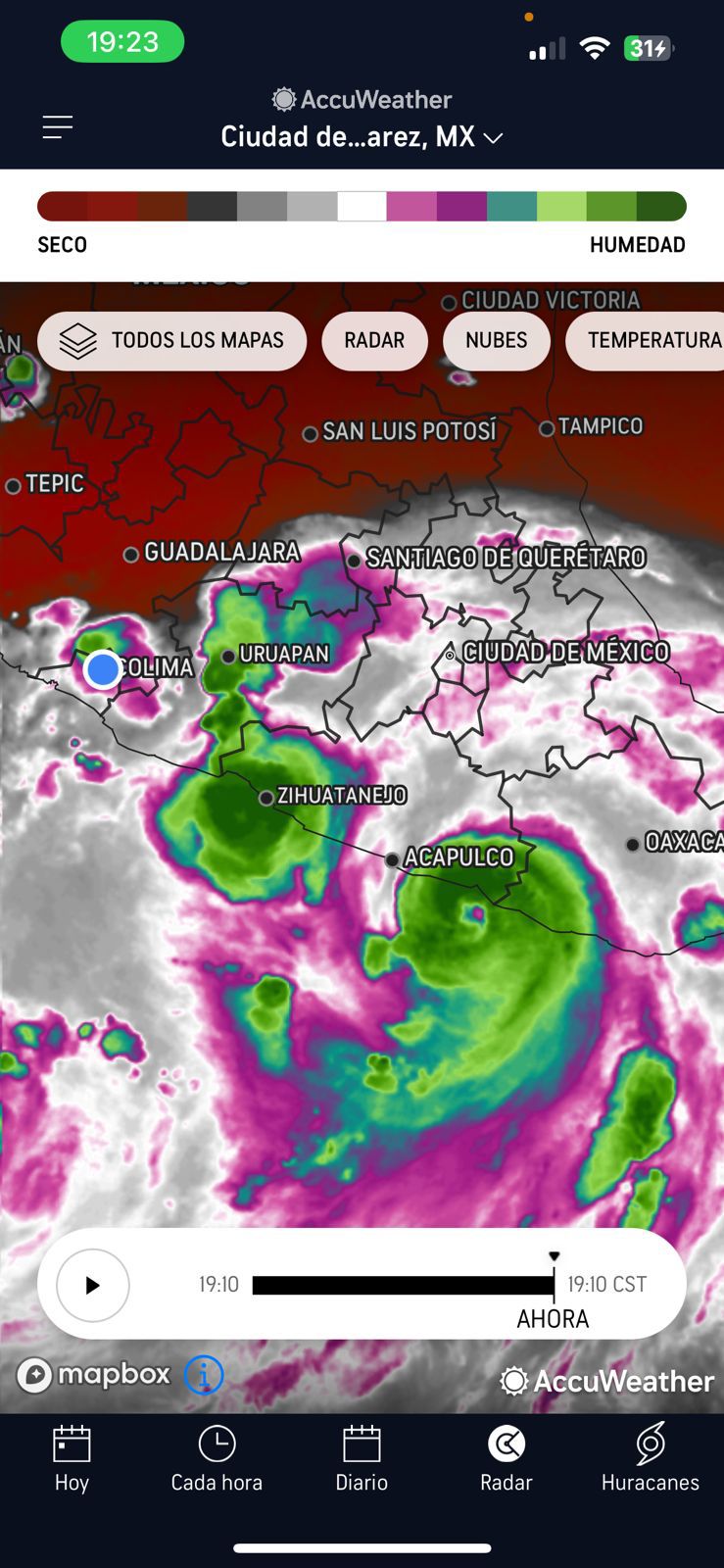 – En la primera imagen se observa una gran concentración de humedad y nubosidad sobre el estado de Colima y áreas circundantes, lo que sugiere la posibilidad de lluvias intensas durante las próximas horas. El sistema tropical ubicado en las costas de *Zihuatanejo y Acapulco* continúa generando fuertes precipitaciones, con acumulaciones significativas de agua en la región.