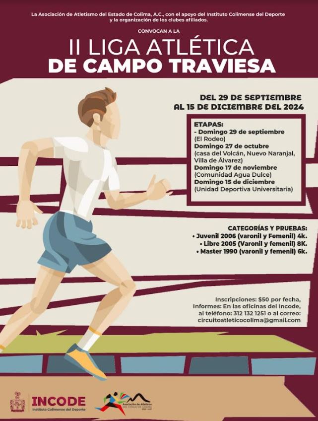 La II Liga de Campo Traviesa se realizará del 29 de septiembre al domingo 15 de diciembre, contemplando las etapas del parque El Rodeo en su fecha inicial, así como en Casa del Volcán, Nuevo Naranjal, el 27 de octubre; comunidad Agua Dulce en Villa de Álvarez, el 17 de noviembre y finalizando en el Polideportivo Universitario el 15 de diciembre; las categorías serán Juvenil 2006, cuatro kilómetros; Libre 2005, ocho kilómetros; y Master 1990, seis kilómetros; en varonil y femenil.
