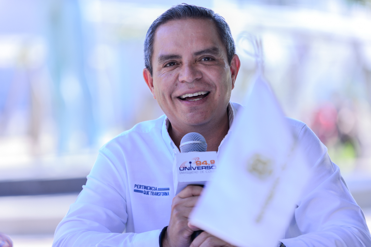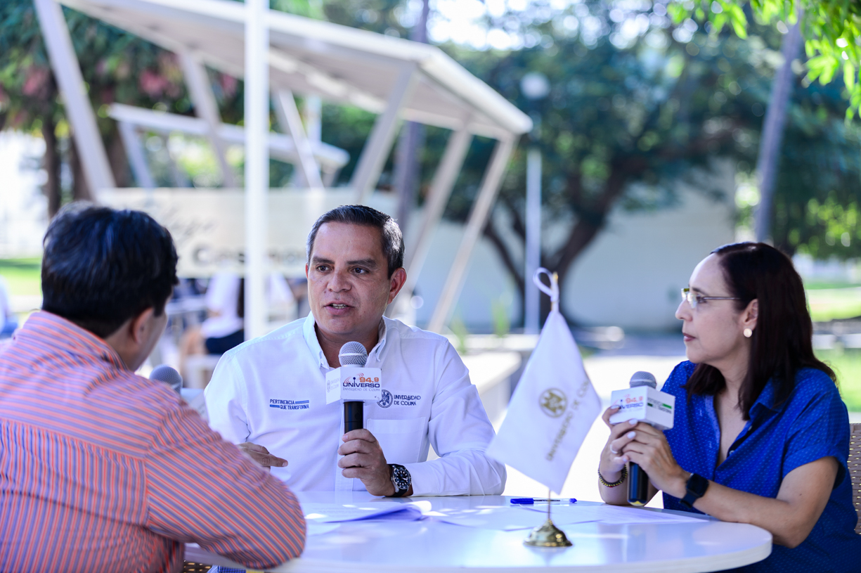Christian Torres Ortiz Zermeño, rector de la Universidad de Colima, al participar en el programa radiofónico “Rectoría en Frecuencia” de Universo 94.9 FM, abordó 4 temas: el 20 aniversario del Archivo Histórico, el cierre de la jornada 2024 de ReforestAcción, la purificadora de agua del campus Colima y de la nueva Plaza Cosmos de la casa de estudios, frente a la cual se transmitió el programa y que inauguró minutos más tarde.