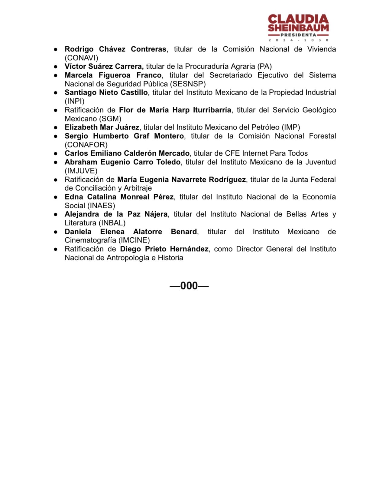 La Presidenta electa de México, Dra. Claudia Sheinbaum Pardo, informa los siguientes nombramientos: