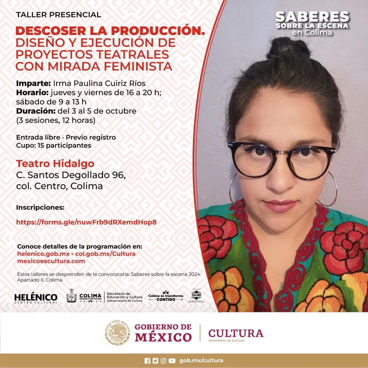 La Subsecretaría de Cultura del Gobierno del Estado de Colima, en coordinación con el Centro Cultural Helénico de la Secretaría de Cultura del Gobierno de México, invita a todas las artistas escénicas interesadas en continuar con su capacitación y profesionalización a integrarse al taller gratuito ‘Descoser la producción. Diseño e implementación de proyectos teatrales con mirada feminista’, impartido por la directora y dramaturga Irma Paulina Cuiriz Ríos.