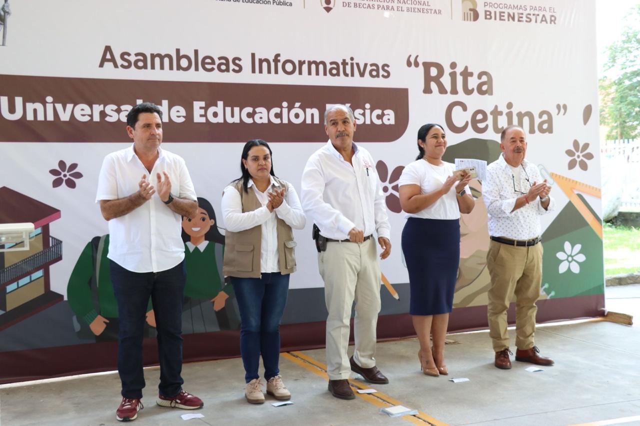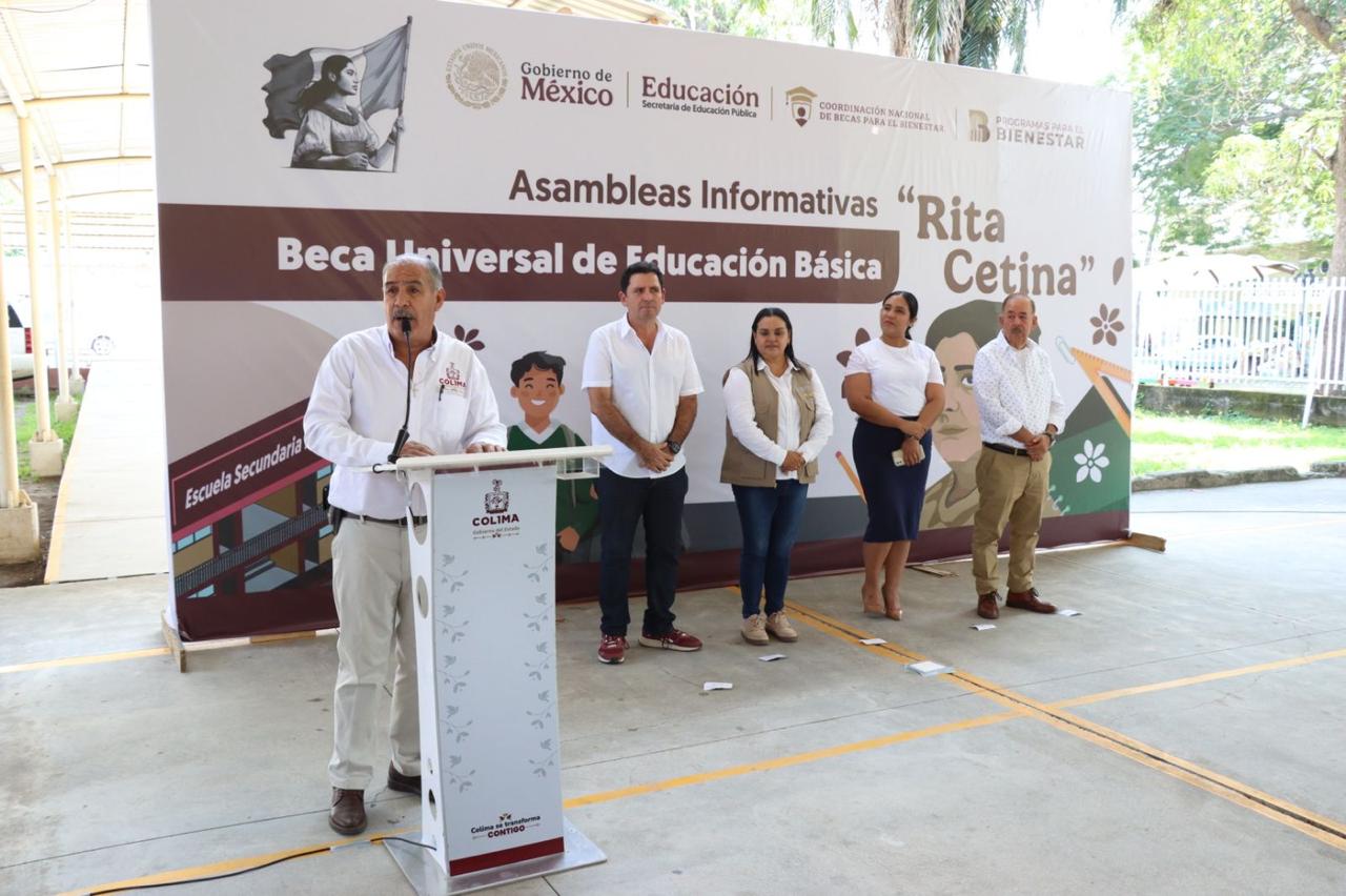 El secretario de Educación y Cultura del Gobierno del Estado de Colima, Adolfo Núñez González, y la delegada de Programas para el Bienestar en la entidad, Rosario Silva Verduzco, encabezaron este lunes la asamblea informativa dirigida a estudiantes, docentes, madres y padres de familia, para dar a conocer los detalles de las becas universales de Educación Básica ‘Rita Cetina’.