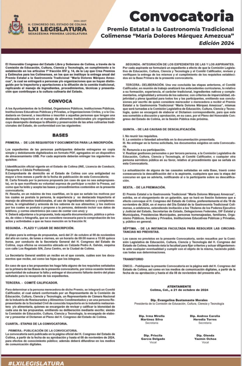 El evento, organizado por el H. Congreso del Estado de Colima, invita a toda la comunidad a participar y nominar a aquellos individuos o agrupaciones que han contribuido significativamente al enriquecimiento del patrimonio culinario de Colima. Se trata de un esfuerzo por destacar la importancia de la gastronomía tradicional y asegurar que estas recetas y prácticas continúen siendo valoradas y transmitidas a futuras generaciones.