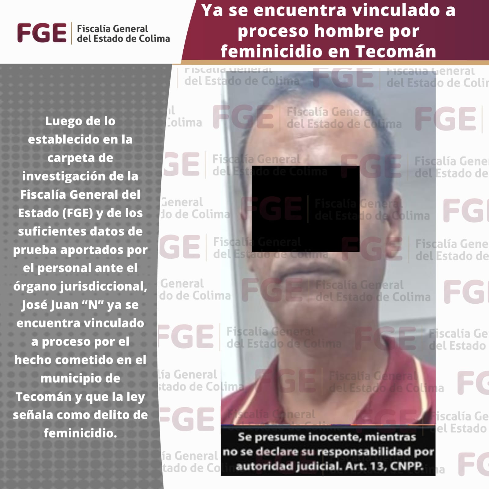 Luego de lo establecido en la carpeta de investigación de la Fiscalía General del Estado (FGE) y de los suficientes datos de prueba aportados por el personal ante el órgano jurisdiccional, José Juan “N” ya se encuentra vinculado a proceso por el hecho cometido en el municipio de Tecomán y que la ley señala como delito de feminicidio.