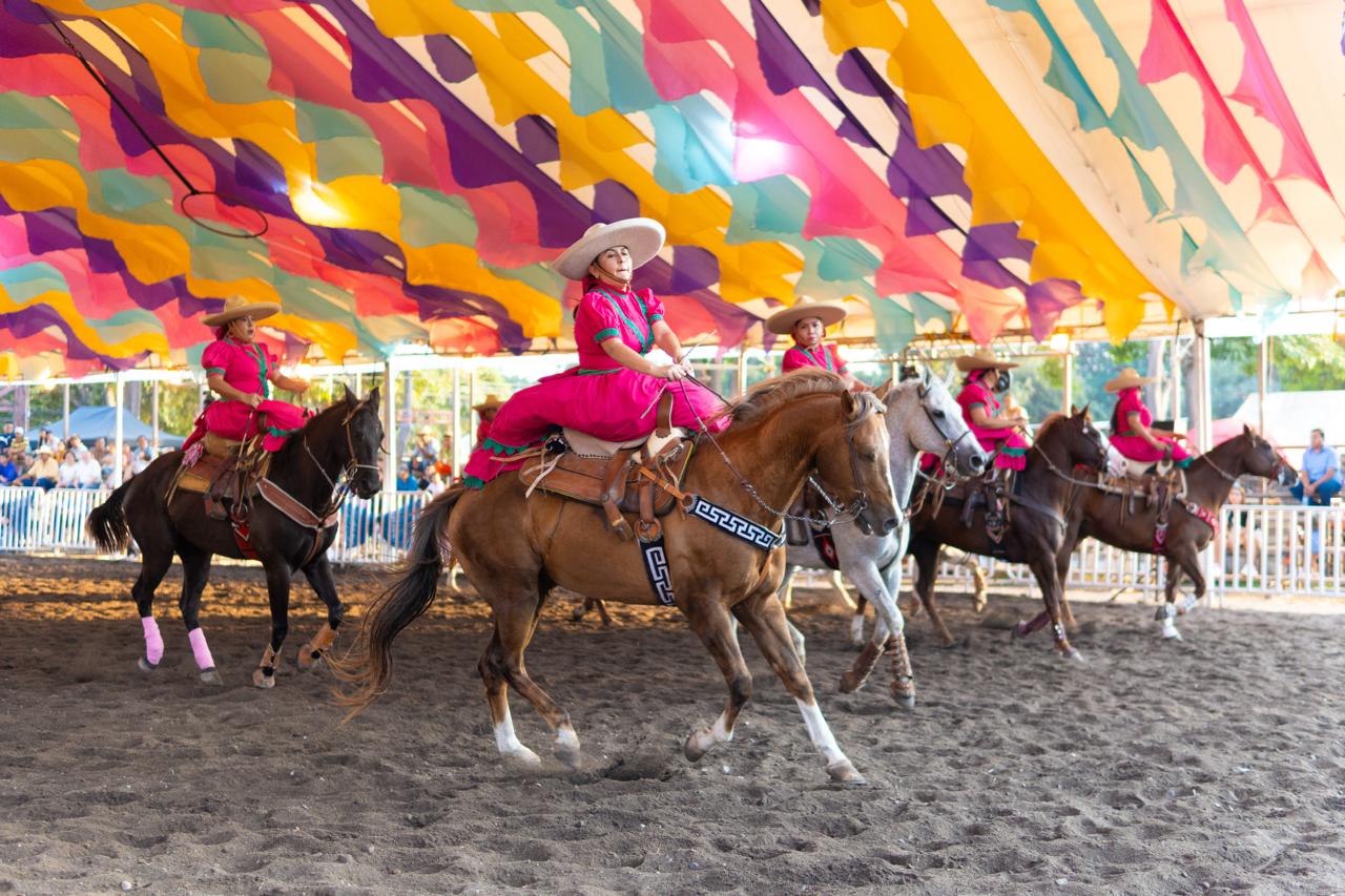 La Feria de Todos los Santos Colima 2024 se engalanó con la participación de doce jóvenes de la Escaramuza Charra de Tecomán, ataviadas en rosa fiusha y verde, compaginando con experiencia y seguridad haciendo que sus ejercicios fueran elegantes y veloces.