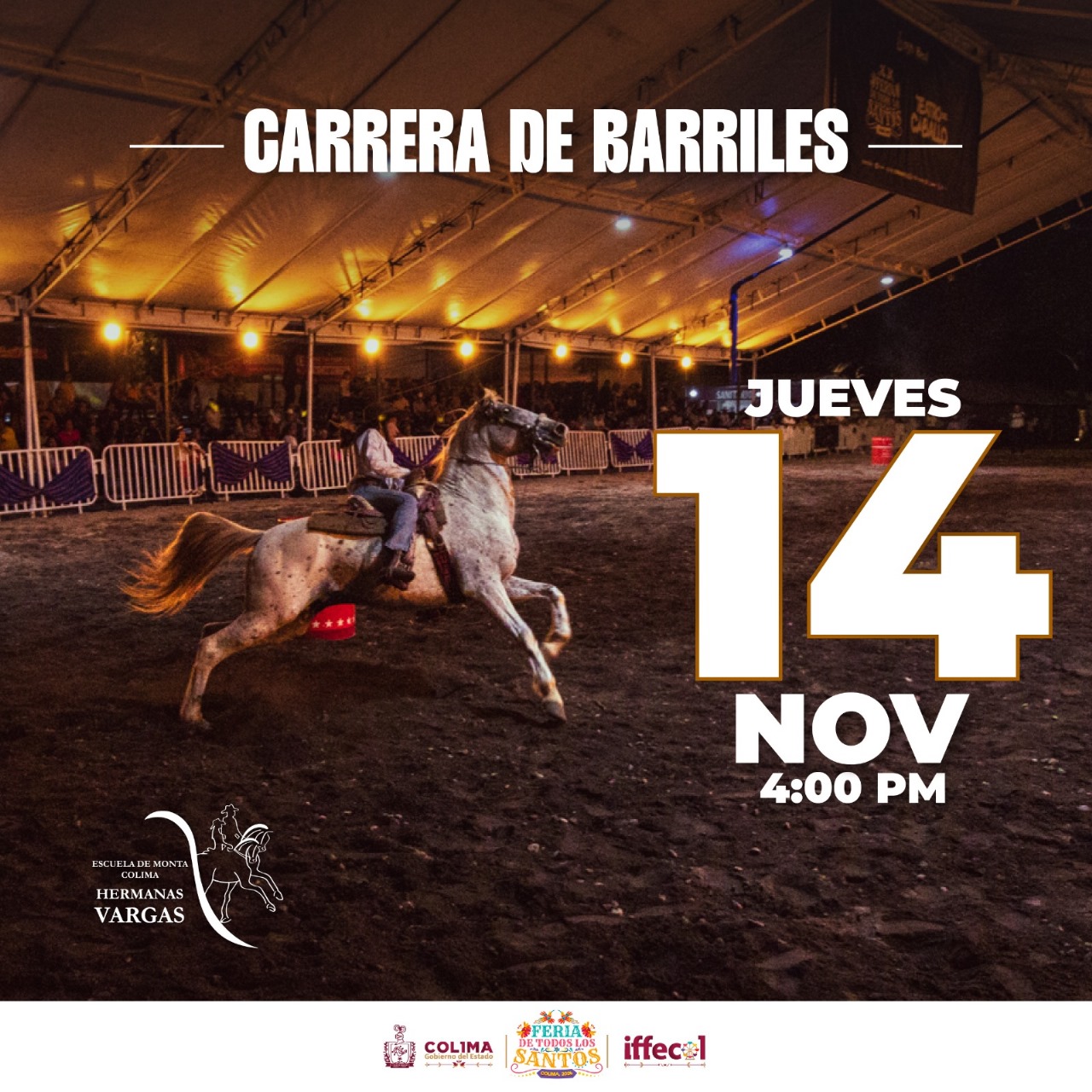 El Instituto de Fomento de Ferias y Exposiciones del Estado de Colima (Iffecol) invita a la población colimense que gusta de las emociones con la actividad de los equipos, para asistir este jueves 14 de noviembre -a partir de las cuatro de la tarde- al ‘Teatro del Caballo’ en la Feria de Todos Santos 2024, donde se realizará la Carrera de Barriles.