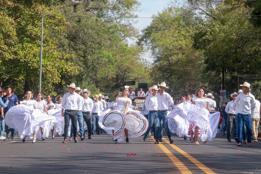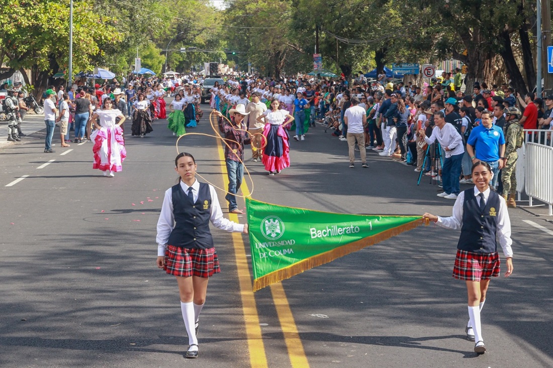 A las 9 de la mañana inició el desfile por la calzada Galván, donde los contingentes llenaron de vida las calles con colores, texturas y música. La Universidad de Colima destacó con la participación de un bloque de 800 integrantes, representando a su matrícula oficial de más de 30 mil estudiantes de todos los niveles educativos, desde bachillerato hasta posgrado.