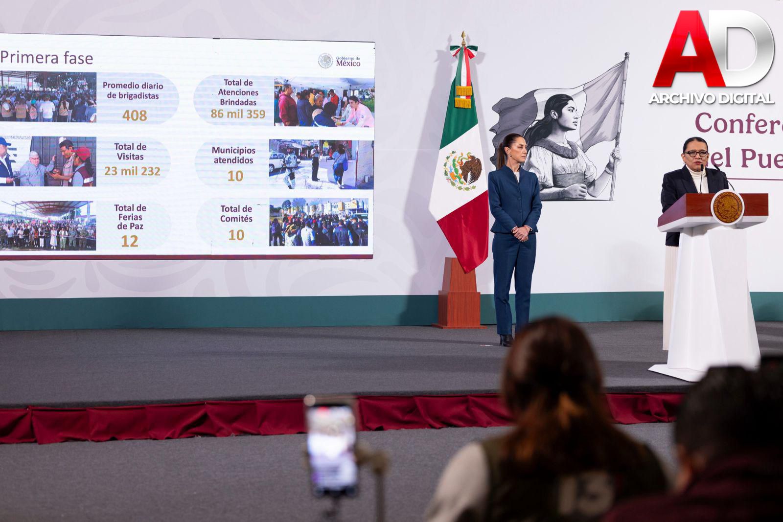 La secretaria de Gobernación, Rosa Icela Rodríguez destacó que para dar cumplimiento al eje de Atención a las Causas se implementó, a través de 37 dependencias y organismos del Gobierno, la primera fase de la Estrategia Nacional de Construcción de la Paz en 10 municipios prioritarios en donde un promedio de 408 brigadistas por municipio realizaron 23 mil 232 visitas; 12 ferias de paz con 86 mil 359 atenciones brindadas y se integraron 10 Comités de Paz.
